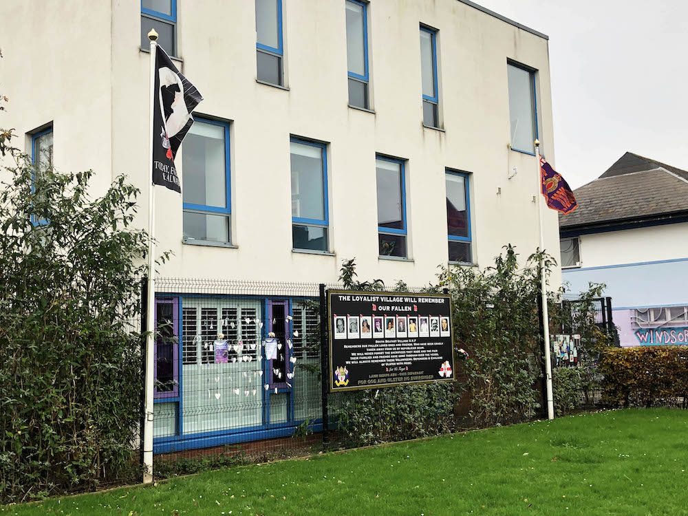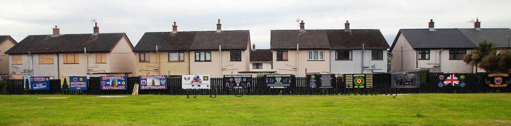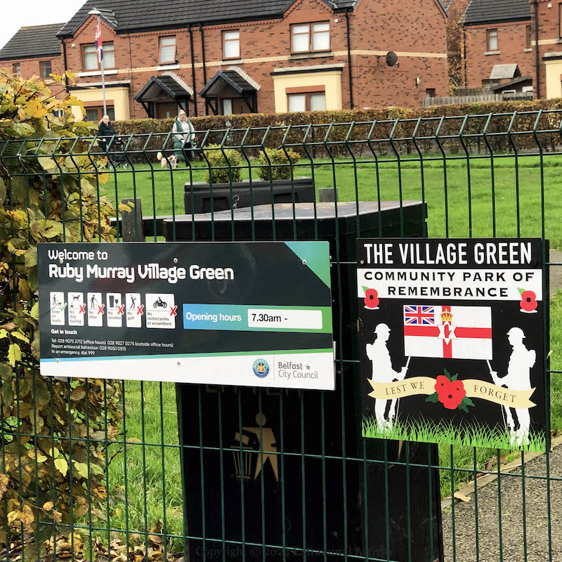 Part of the most recent development of the upper streets in the Village was not to rebuild the two rows of houses on Ebor and Nubia/Moltke streets and in their place construct a park – the Village Green, and now officially the “Ruby Murray Village Green” – and playground. The board on the outside railings make the park a “community park of remembrance” for WWI, showing an Ulster Banner with a Union Flag in the canton. (Seen previously in The Village Green Preservation Society.)