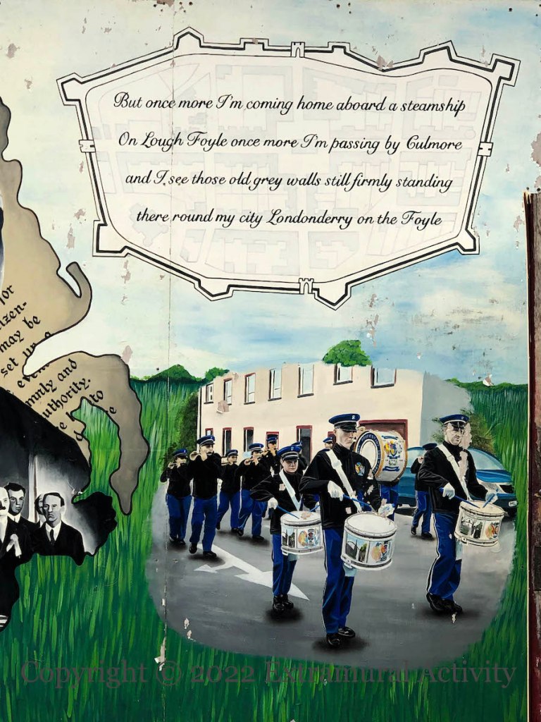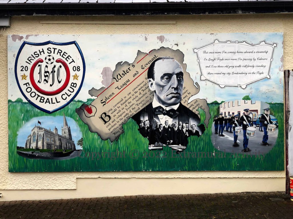 The sights and sounds of Irish Street and Londonderry: (clockwise from right) a verse from Londonderry On The Foyle (youtube) in a frame of the walls of the city of Derry – “But once more I’m coming home aboard a steamship/On Lough Foyle once more I’m passing by Culmore/And I see those old grey walls still firmly standing/There ’round my city Londonderry on the Foyle”; East Bank (Irish Street) Protestant Boys (Fb) on parade; Carson and the signing of the 1912 Covenant; St Columb’s Cathedral; Irish Street FC (Fb).