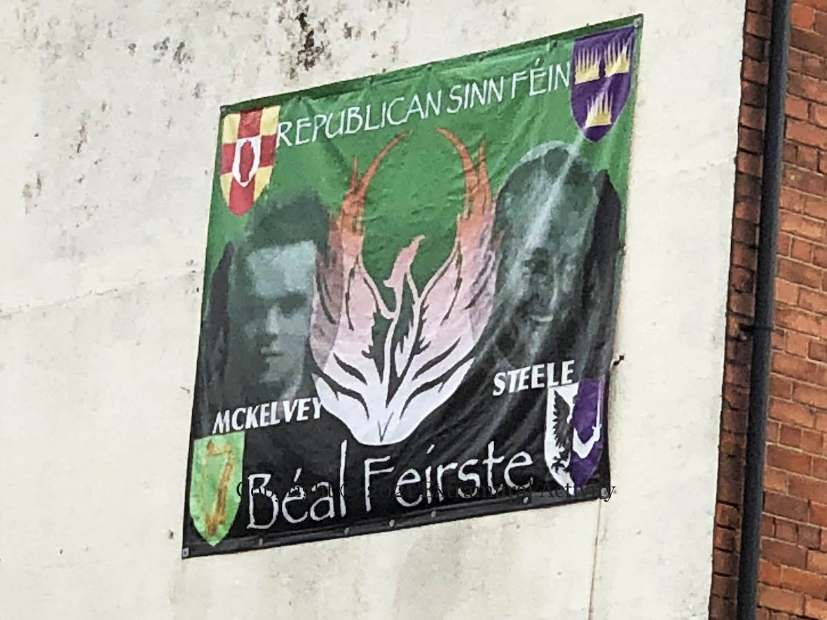 This tarp, above the office of Sınn Féın Poblachtach and the Happy House on the Falls Road, celebrates two previous generations of IRA leadership. Joe McKelvey was commander of the Belfast Brigade of the IRA in the War Of Independence but against the Treaty; he was executed in December, 1922, for occupying the Four Courts in June (WP). Jimmy Steele was a leader in the Belfast IRA from the 1920s to 1960s and the first editor of Republican News; he died shortly after the split (WP).