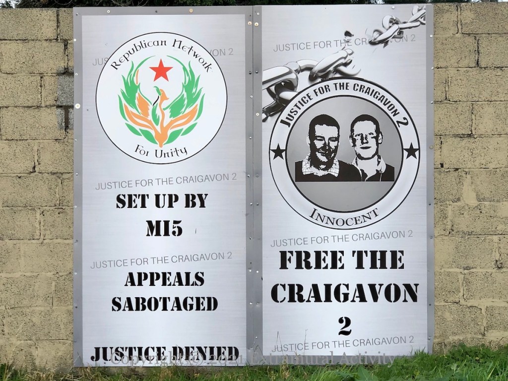 The “Craigavon 2” are Brendan McConville and John-Paul Wootton; they were convicted of the 2009 murder of PSNI constable Stephen Carroll. The “set up by MI5” and/or “appeals sabotaged” on the RNU board shown above is a reference to the claim that MI5 agent Dennis McFadden had infiltrated the campaign for justice for Brendan McConville (Irish News). Also at this site are graffiti about Noah Donohoe and an anti-drug-dealer board from Saoradh.