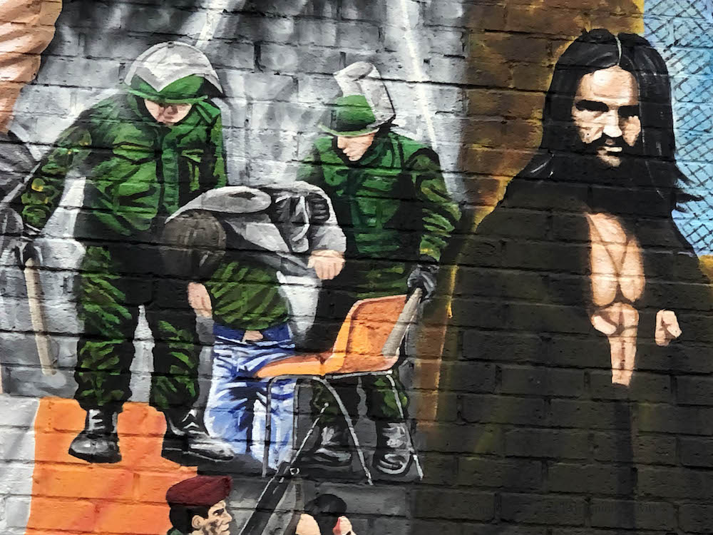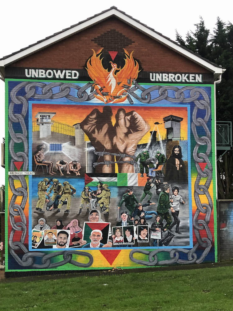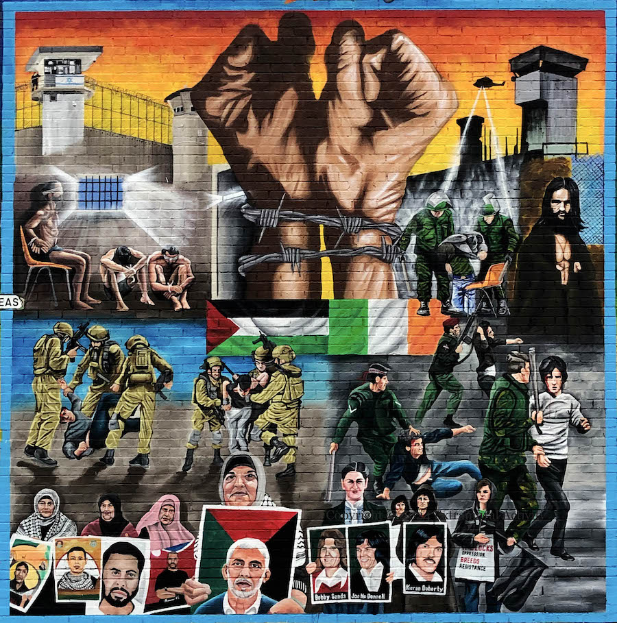 The main panel puts the struggles in Palestine and Northern Ireland in parallel, showing (from top to bottom on each side) political prisoners, violence against protesters, and relatives carrying portraits.