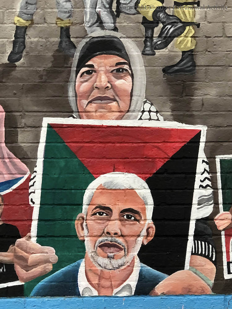 In 2000, during the Second Intifada, Palestinian teenager Faris Odeh was photographed by an AP photographer in the act of throwing a stone at an Israeli tank. He was shot and killed a few days later and the image became a symbol of resistance. (A mural of the photograph was painted in Springhill: see David And Goliath.) The iconic image is updated here for Israel’s current invasion of Gaza, showing a young girl with a soft toy standing in front of a tank that is bedecked with the flags of the European Union, France, the USA, the UK, and Germany.