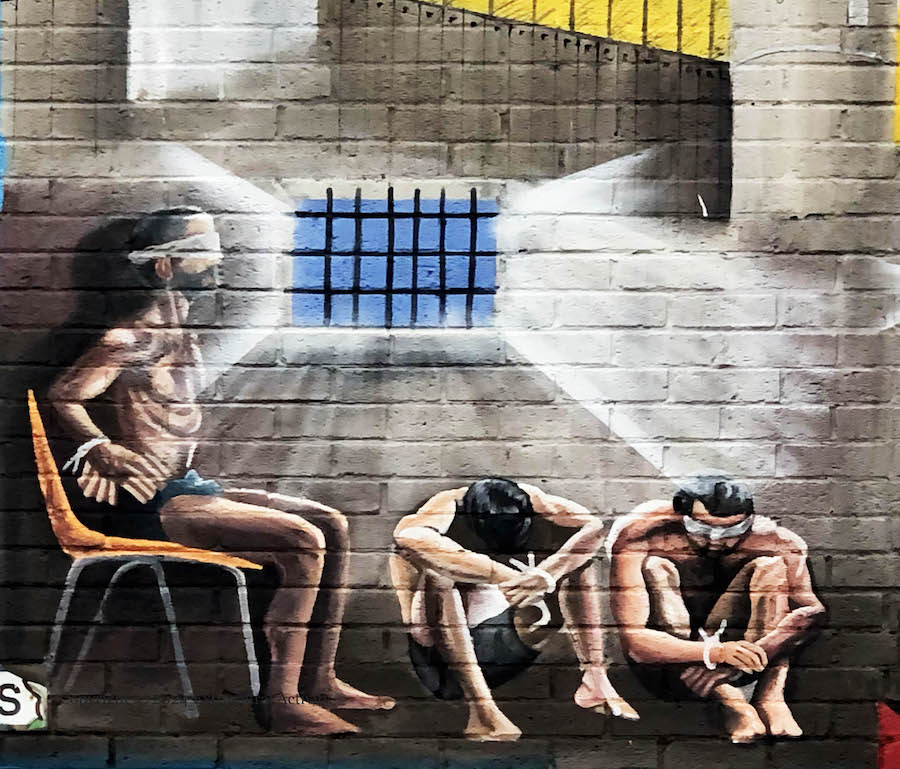 On the left, Palestinian prisoners languish in Israeli jails (based on a photo of Hamza Abu Halima and on this Reuters photograph of prisoners sitting in the street, both from December 2023) and IDF soldiers make violent arrests – the one on the left is from 2016 (CCUN) and the one on the right is perhaps based on this Reuters photograph.