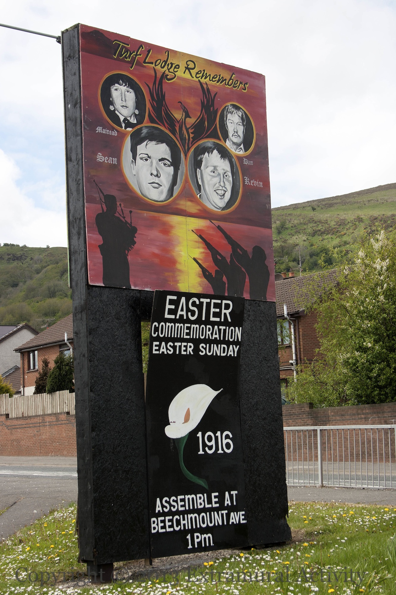 The eastern side of the H-Block ‘H’ at the top of Monagh Road as it was in May, 2013, with a board in memory of the Gibraltar three (Dan, Mairead, Sean ) and another volunteer killed a few days later (Kevin) (for background, see both 25 Years In Progress | Completed) and announcing an Easter Sunday rally commemorating the 1916 Rising.