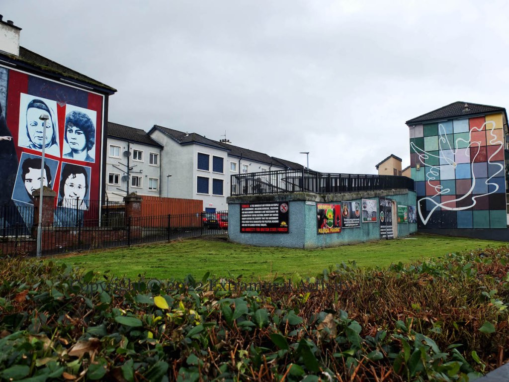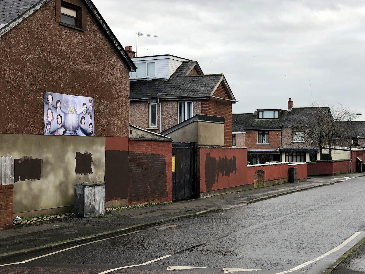 The wall was completed by early December, 2024, and the roll of honour added in the top-left corner by the end of the month. Those listed are: Hugh Ferguson, Danny Loughran, Brendan McNamee, Miriam Daly, Ronnie Bunting, Noel Little, Jim Power, Matt McLarnon, Joe Craven, Paul “Bonanza” McCann, Thomas “Ta” Power, John O’Reilly, Mickey Kearney, Emmanual Gargan, Gino Gallagher, John McColgan, Patrick Campbell, Christopher “Crip” McWilliams, Harry O’Hara, Barry “Bar” McMullan, Martin McElkerney, James McWilliams. The last five post-date the Agreement, starting with Patrick Campbell, who died in 1999 at the hands of drug-dealers in Dublin (Irish Times | Bel Tel).