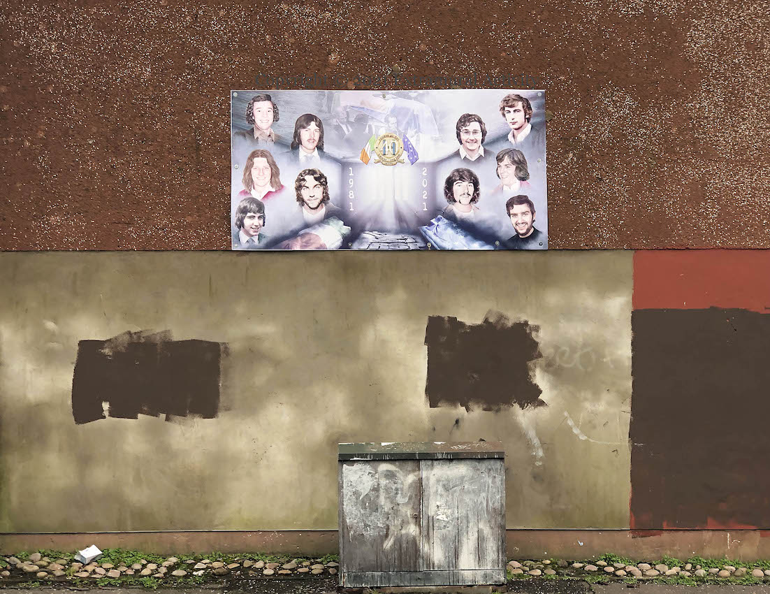 This installation in Galliagh, Derry, has a portrait of each of the ten deceased 1981 hunger strikers on a large “H” as well as the central board shown above – the coffin being carried is that of Kevin Lynch – see For A Socialist Republic.