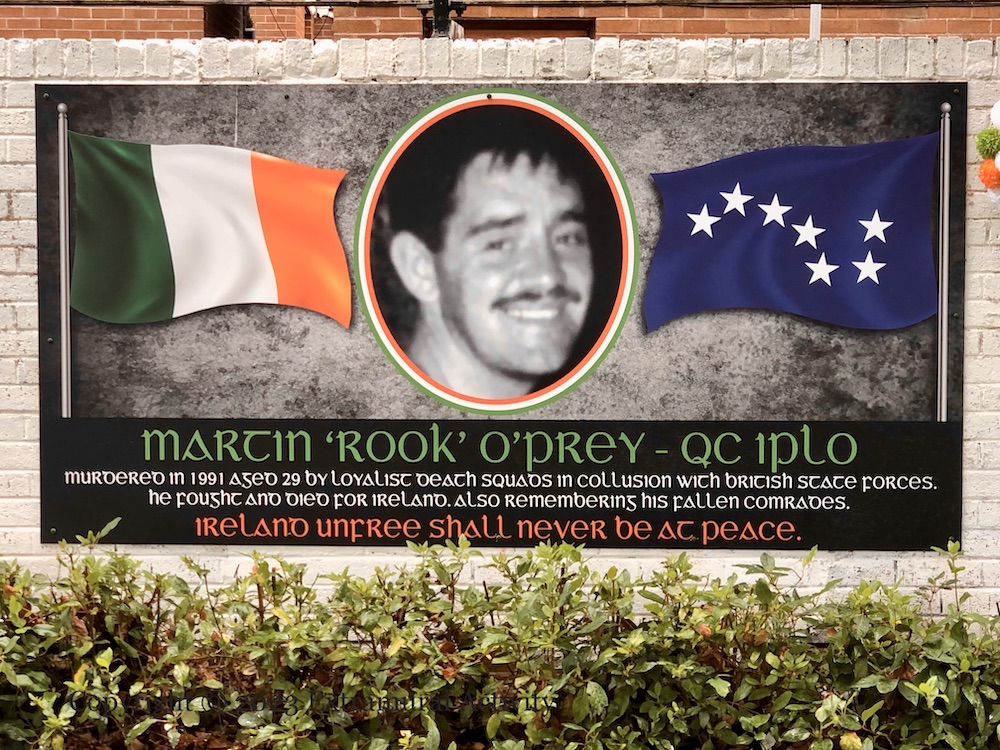“Martin ‘Rook’ O’Prey – OC IPLO. Murdered in 1991 aged 29 by loyalist death squads in collusion with British state forces. He fought and died for Ireland. Also remembering his fallen comrades. “Ireland unfree shall never be at peace.””
