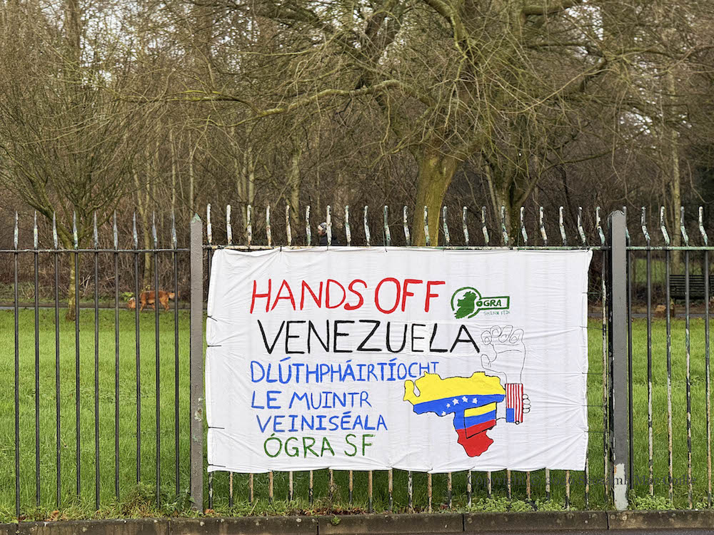 “Hands off Venezuela – Dlúthpháırtíocht le muınt[ı]r Veınıséala [Solidarity with the people of Venezuela]” Commentary from Ógra Shınn Féın (web) on the recent US actions against Venezuela, which have included attacks on small boats beginning in September 2025 (WP), an embargo on oil leaving the country announced in December 2025 (Guardian), and most recently (January 2nd) air-strikes on targets in and around Caracas and the capture of Nicolás Meduro and Cilia Flores (BBC). After the removal of Meduro, US President Donald Trump said that the US would run Venezuela and that between 30 and 50 million barrels-worth of Venezuelan oil would be shipped to the US, sold, and the proceeds disbursed by Trump himself “to ensure it used to benefit the people of Venezuela and the United States” (AP).