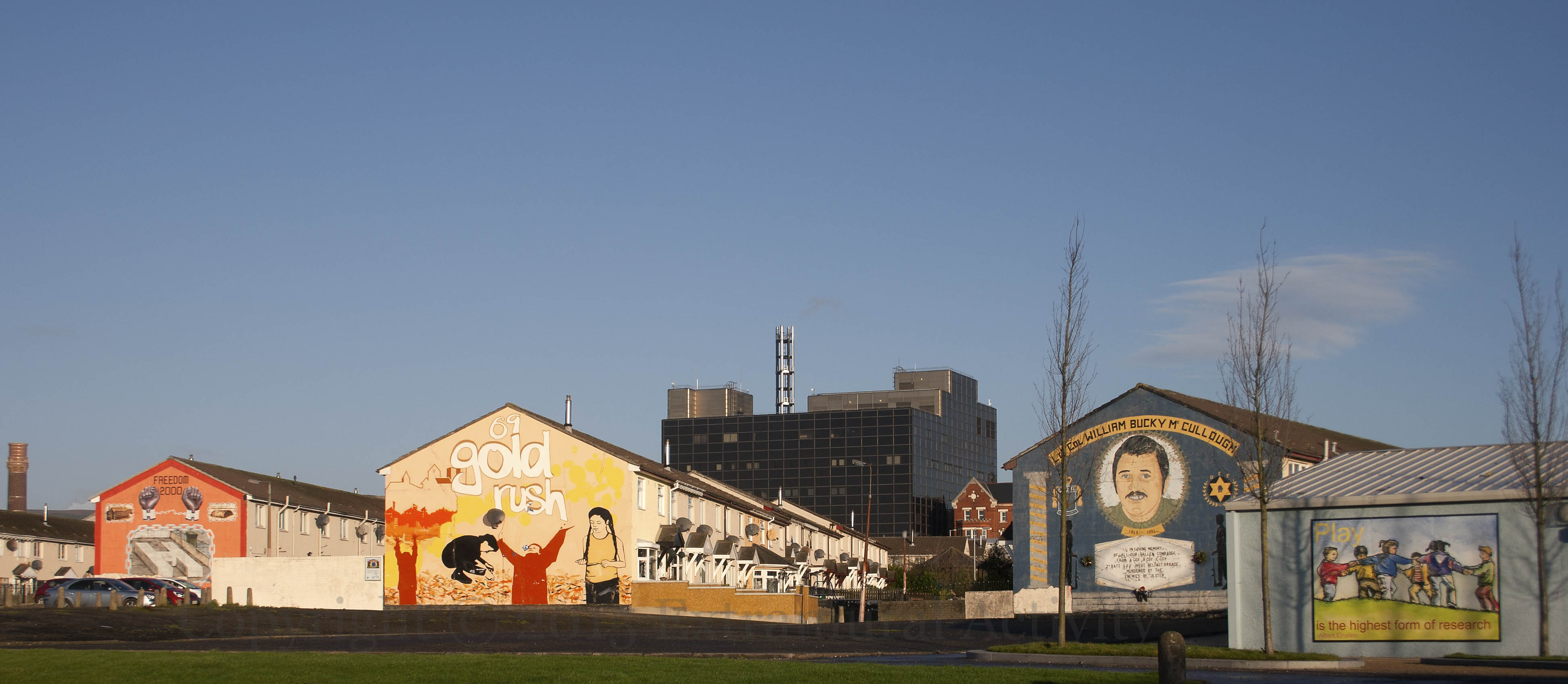 Here’s a wide shot of the right-hand side of the murals in the lower Shankill estate. These gables have remained in place while the estate has been redeveloped, causing the removal of the Red Hand, Martin Luther and Cuchulainn murals.