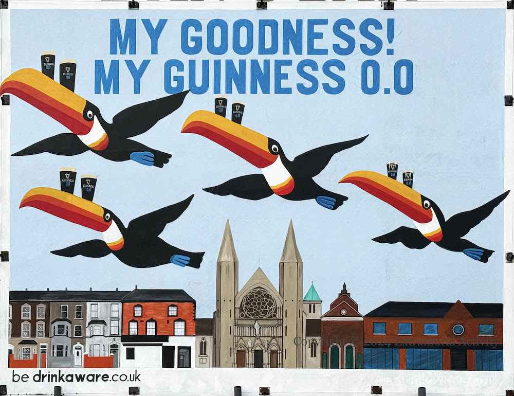 The Guinness toucans – invented in the 1930s by John Gilroy (Collectors’ Weekly | Guinness Project) – balance pints of “Guinness 0.0” on their beaks as they fly over Clonard Monastery and the houses and shops along the Springfield Road, including (in white) Dan’s Bar (Fb), which is the site of this large poster (on its Cupar Street side).