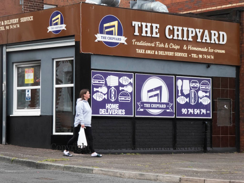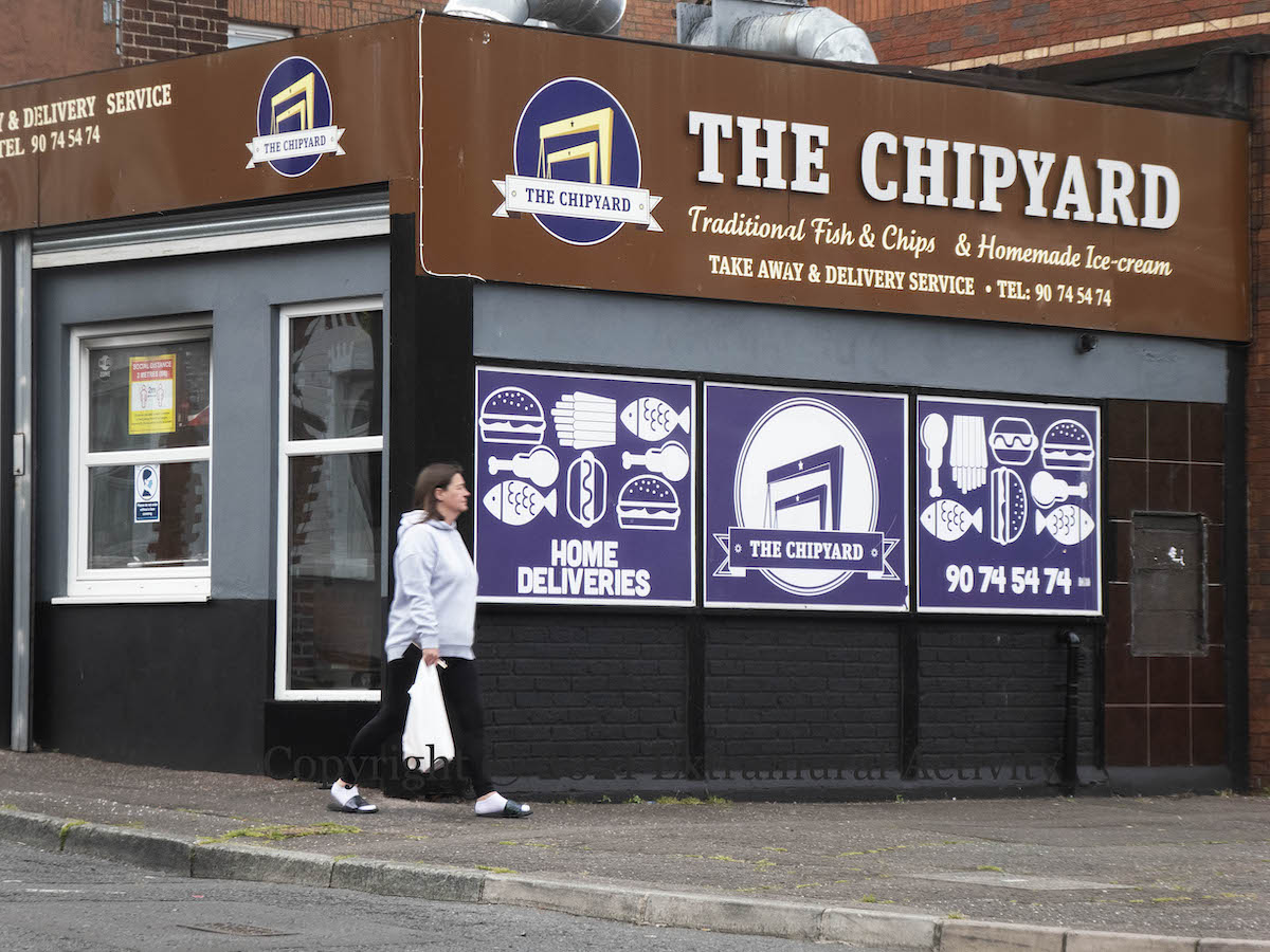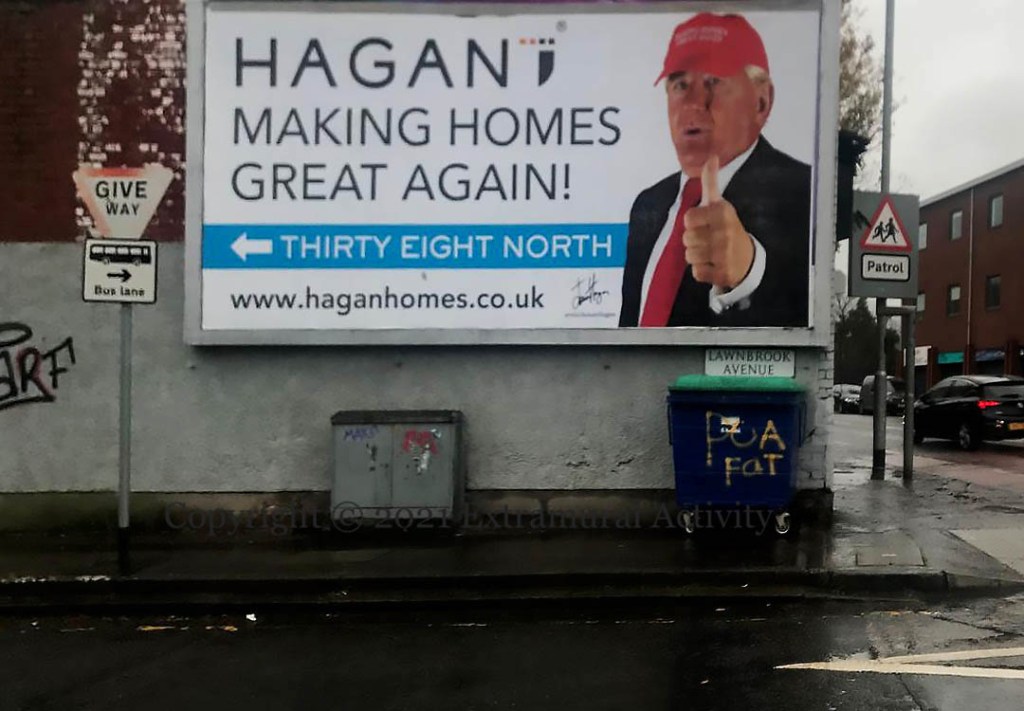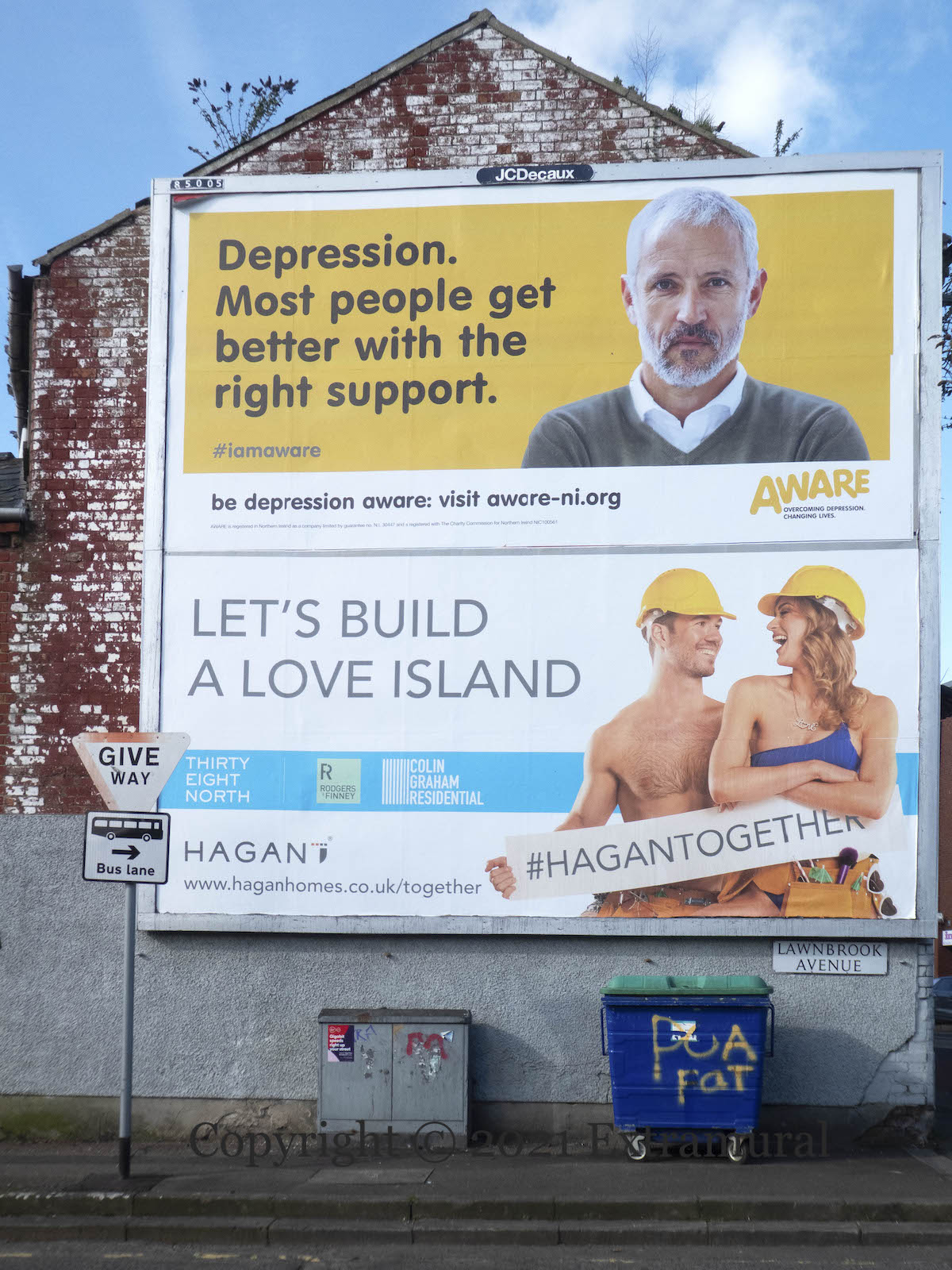The Bellevue steps lead from the Antrim Road to Floral Hall, which served as a concert and dance hall before closing in 1973 and since becoming dilapidated. There have been various plans and calls for redevelopment, even in the last five years (one | two | three) and there is a Facebook group dedicated to restoring Floral Hall, but nothing has happened. As the wide shot (below) shows, the famous steps too are overgrown; the facade at least has been painted with zoo animals, by London artist Irony (ig) (Belfast Media). The lion’s name is Quays (Zoo); the giraffe is called Ballyronan (BelTel); the flamingos’ names are unknown.