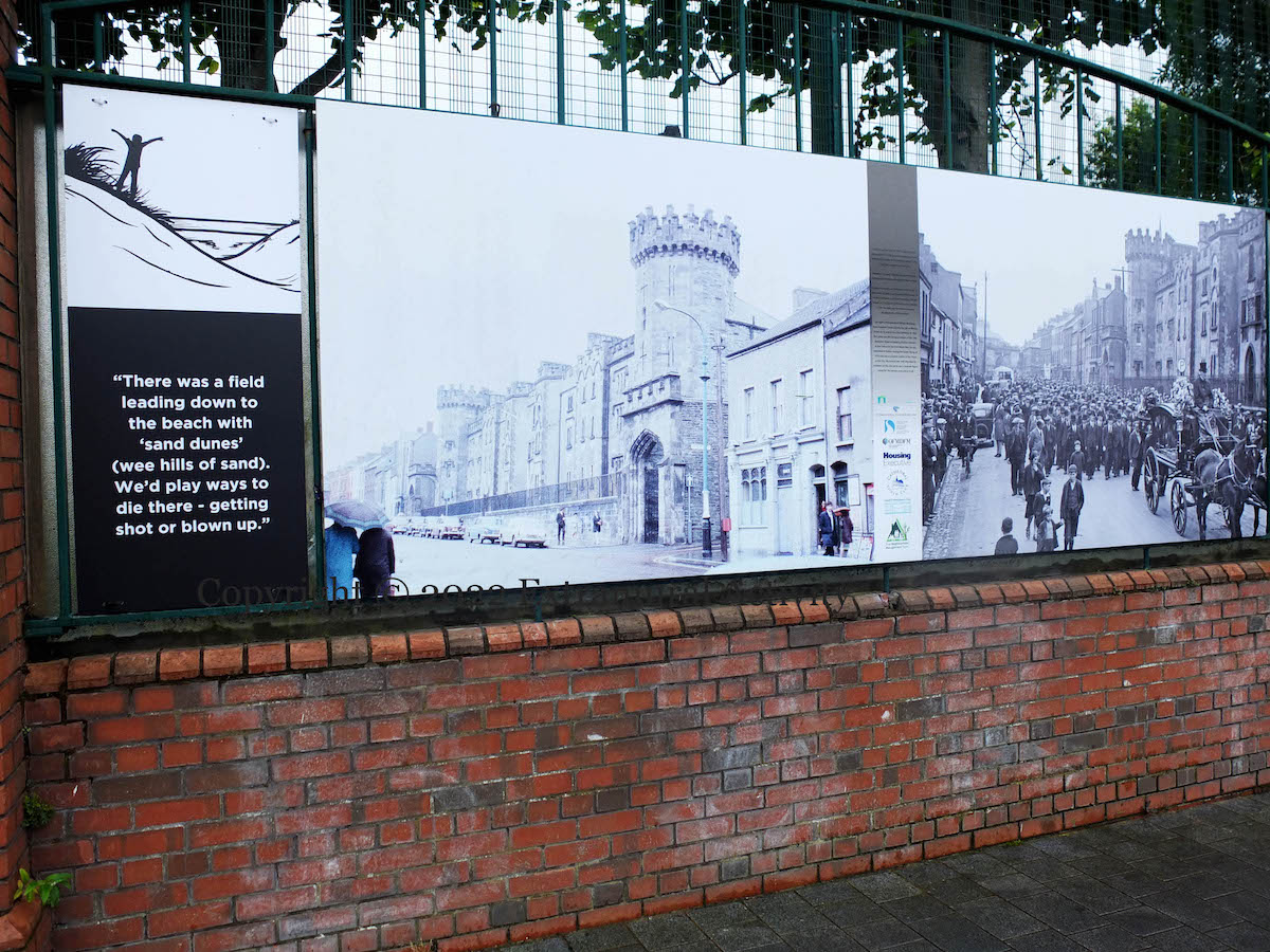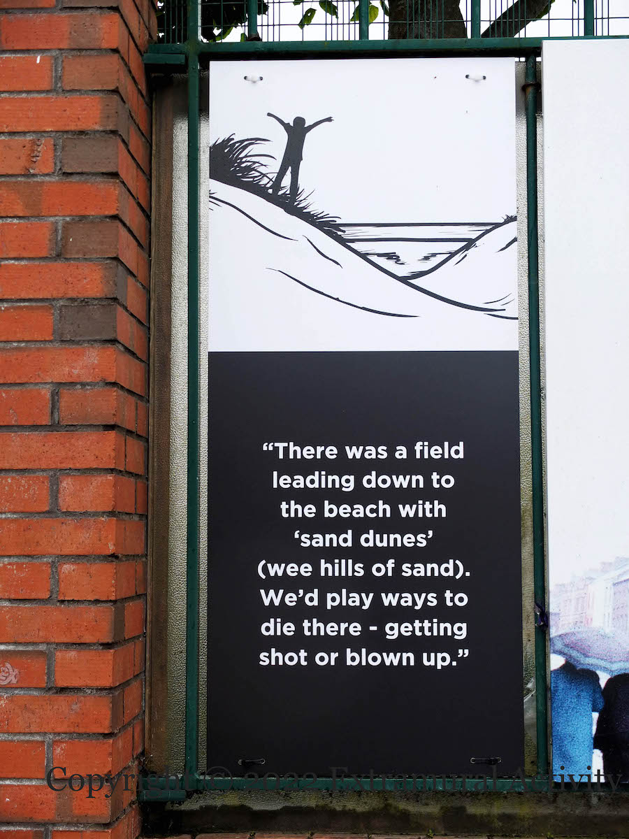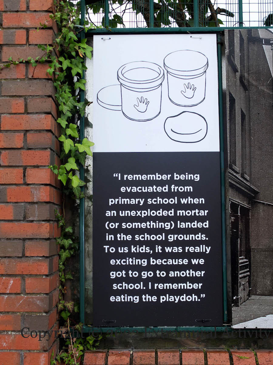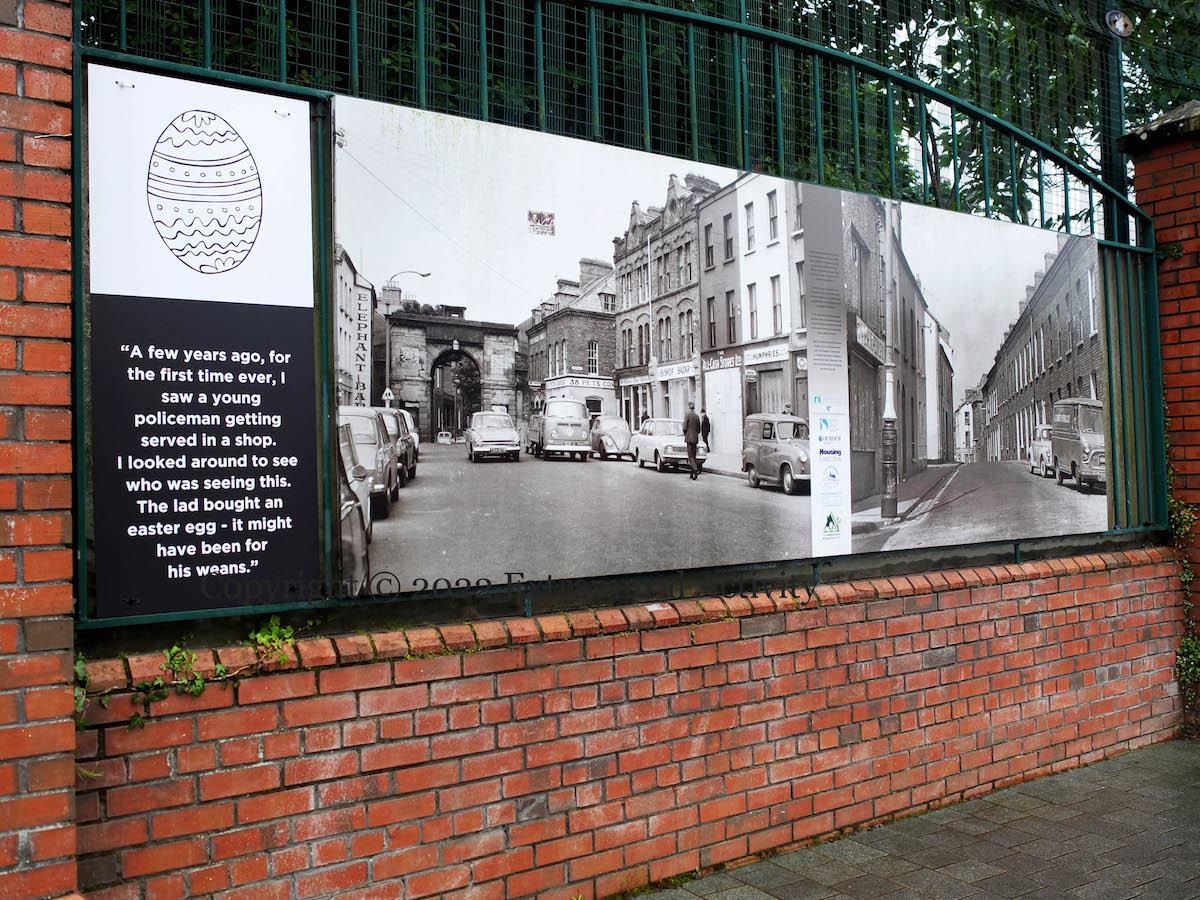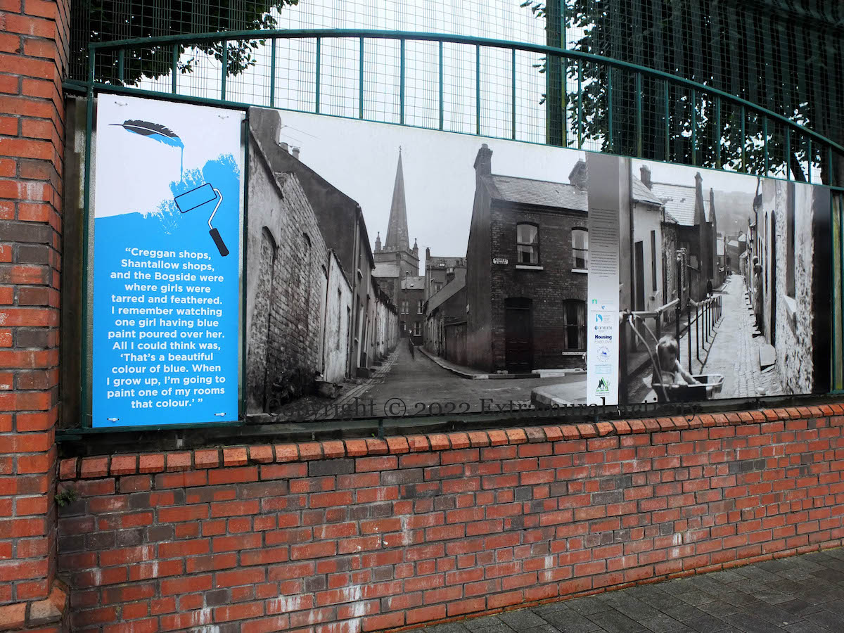 According to a history of Brown’s Square, the area was known as “the oasis” during WWII on account of its 3 dance-halls and 22 pubs (Religion, Riots And Rebels). As with so much publicly-funded art (though we cannot find any provenance for this art) it depicts Belfast in the “good old days” – that is, before the Troubles, which produced the so-called “peace line” dividing west Belfast.