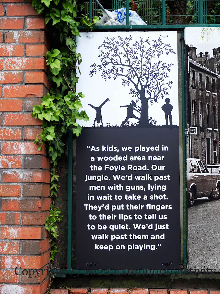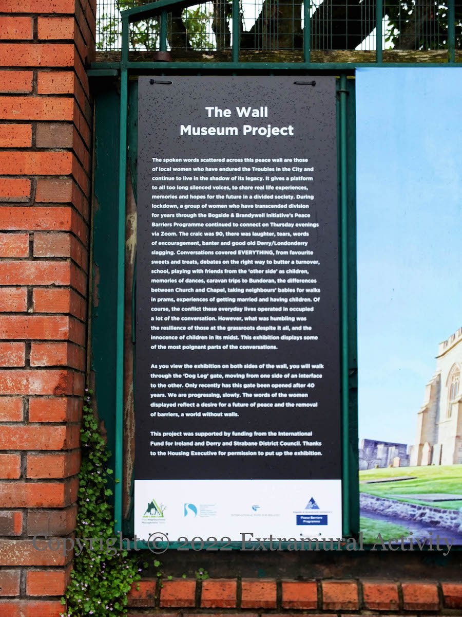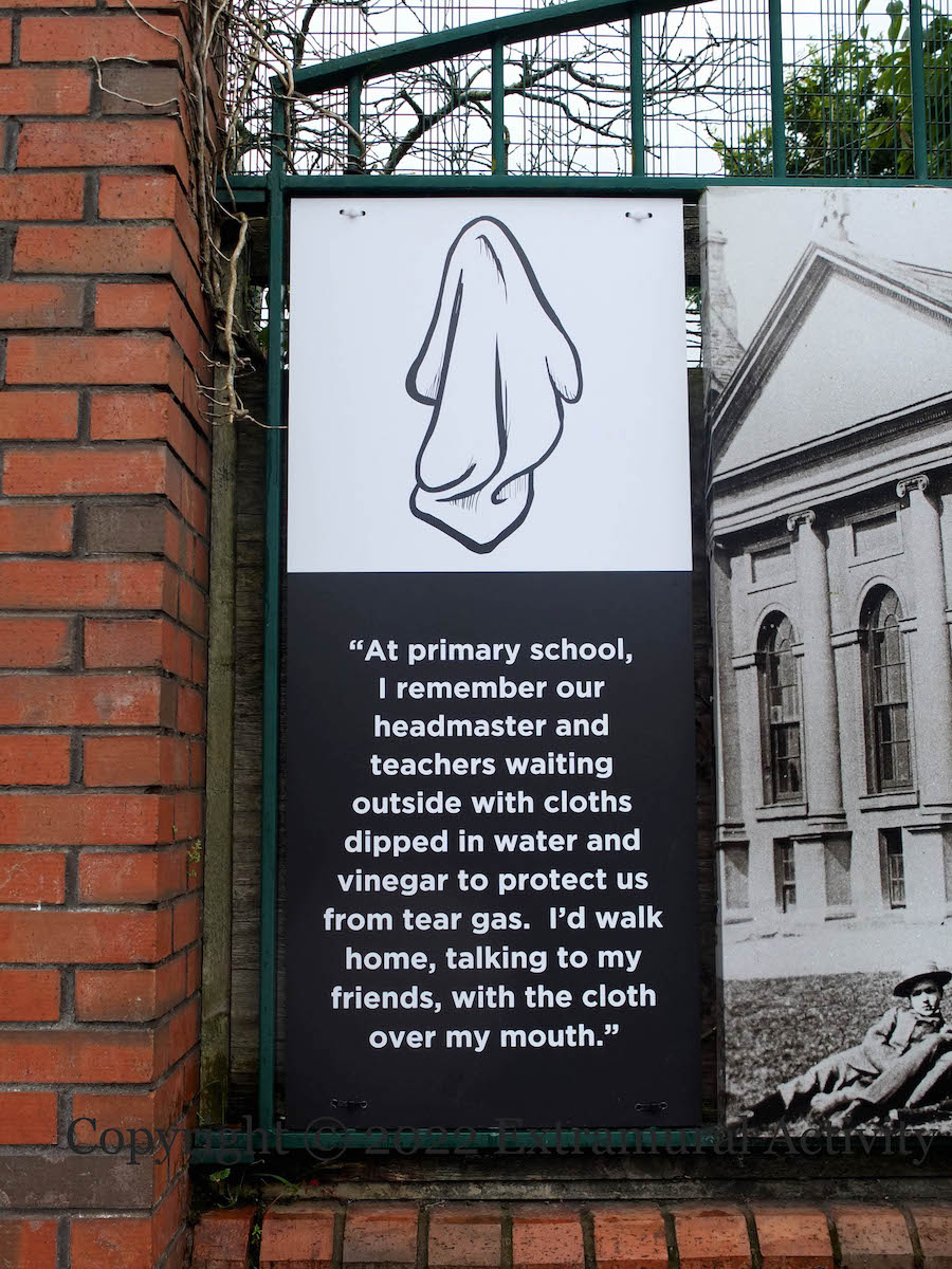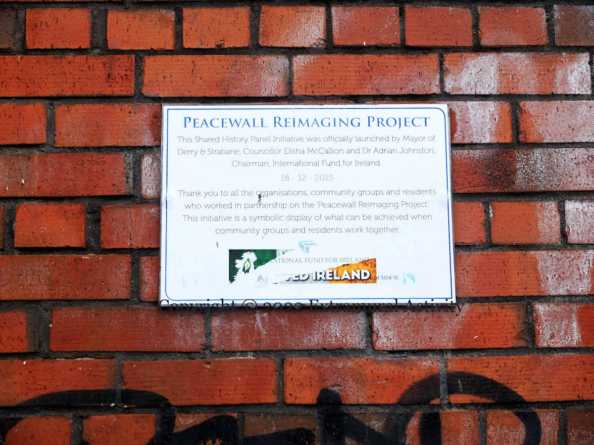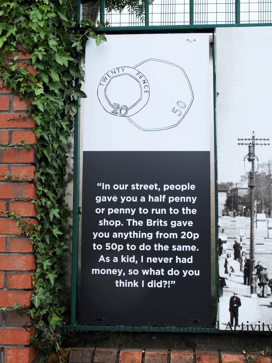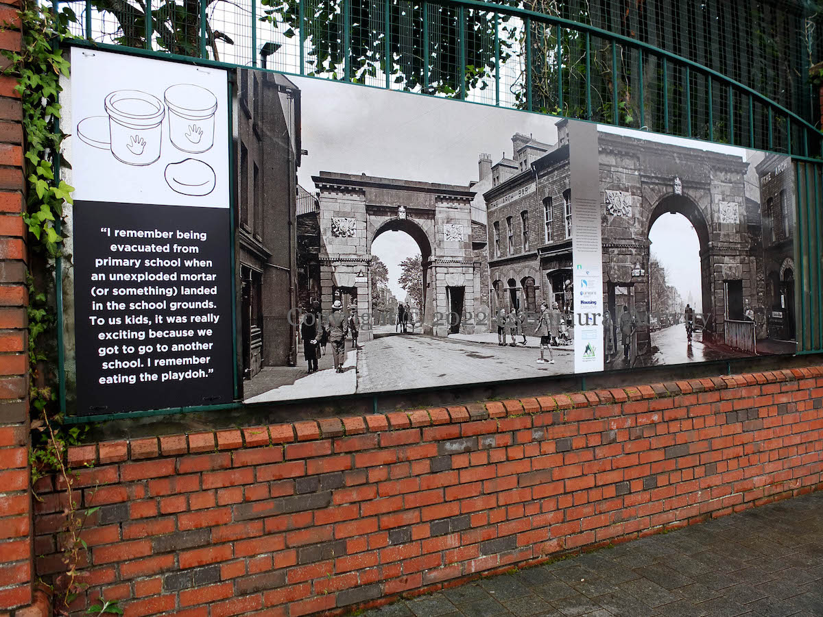 According to a history of Brown’s Square, the area was known as “the oasis” during WWII on account of its 3 dance-halls and 22 pubs (Religion, Riots And Rebels). As with so much publicly-funded art (though we cannot find any provenance for this art) it depicts Belfast in the “good old days” – that is, before the Troubles, which produced the so-called “peace line” dividing west Belfast.