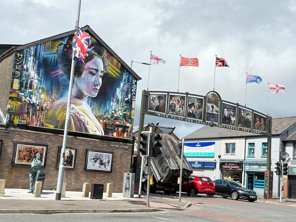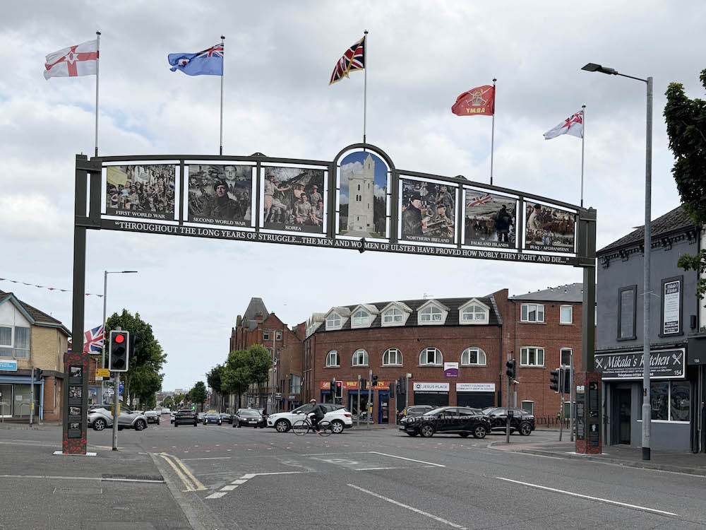 “The ‘Ulster Military Memorial Arch’ was funded by the generosity of the local business community, local residents, and our friends from Scotland. The arch was designed entirely by the people of the Greater Shankill, and erected to coincide with the 80th anniversary of VE Day 8th May 1945 – 8th May 2025. Our servicemen and women are proudly remembered.” For images of the VE Day launch, see the BelTel.