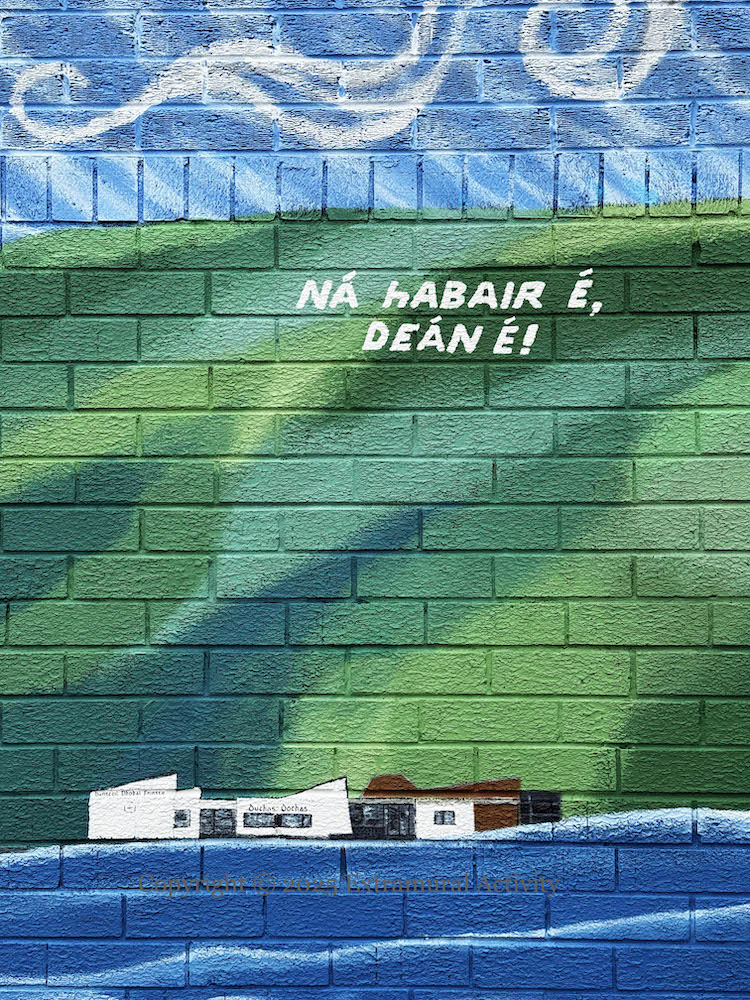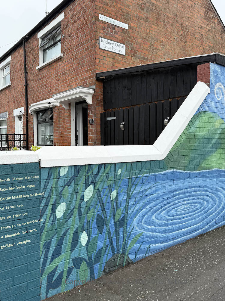 This mural celebrates the Irish-language institutions in west Belfast. From left to right, the buildings by the loch are: Gaeltacht Bhóthar Seoıghe, Bunscoıl Phobal Feırste, Raıdıó Fáılte, An Chultúrlann, Teach Ard Na bhFeá, Coláıste Feırste, and Áras Na bhFál. In a sense they are all ripples from the initial drop that was the Shaw’s Road Gaeltacht, established in 1969 and which led quickly to the bunscoıl in 1971 (WP). The NVTv documentary about the Shaw’s Road gaeltacht borrows its title from the slogan motivating the early efforts, “Ná habaır é, déan é” [Don’t say it, do it] – the bunscoıl was not officially recognised until 1985.