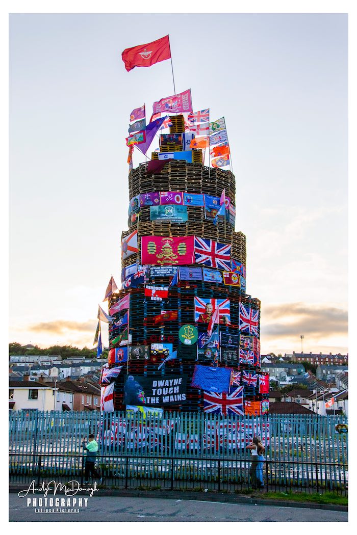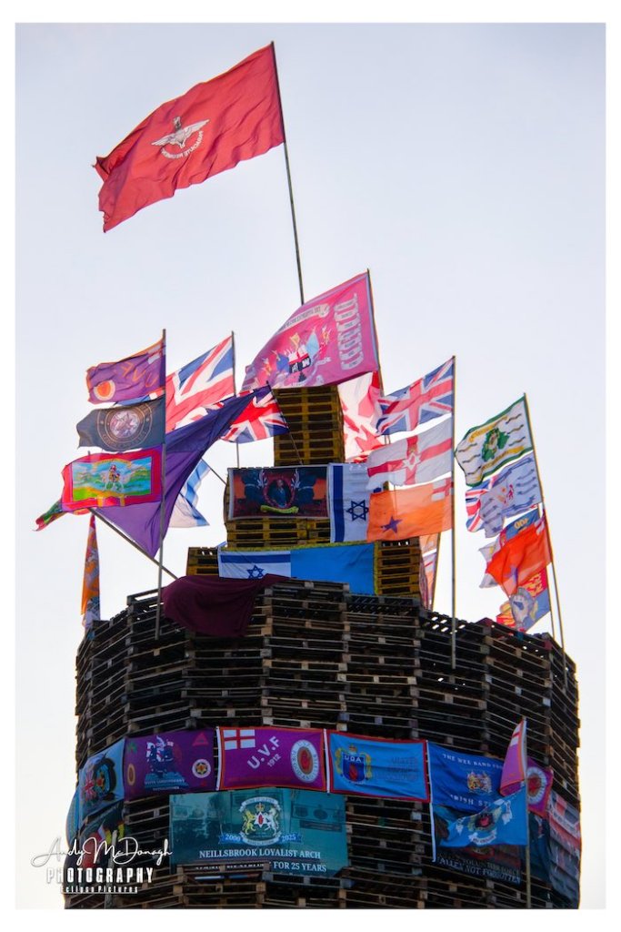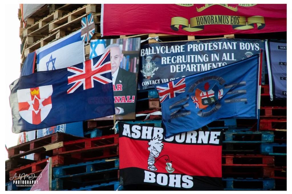 This year’s internment bonfire in Derry’s Bogside was swathed in flags prior to being set alight. The flags of the UK, Northern Ireland, and Israel can be seen in numbers, as well as flags of the SAS, Paras, IDF, UVF, LVF, UDA, ABOD, various flute bands, King Billy, King Charles, “deport, not support”, and … Bohemians FC, in connection with rioting at a match in July (BBC | BBC).