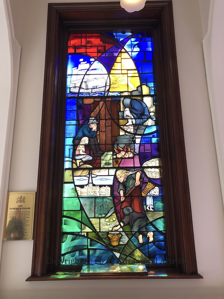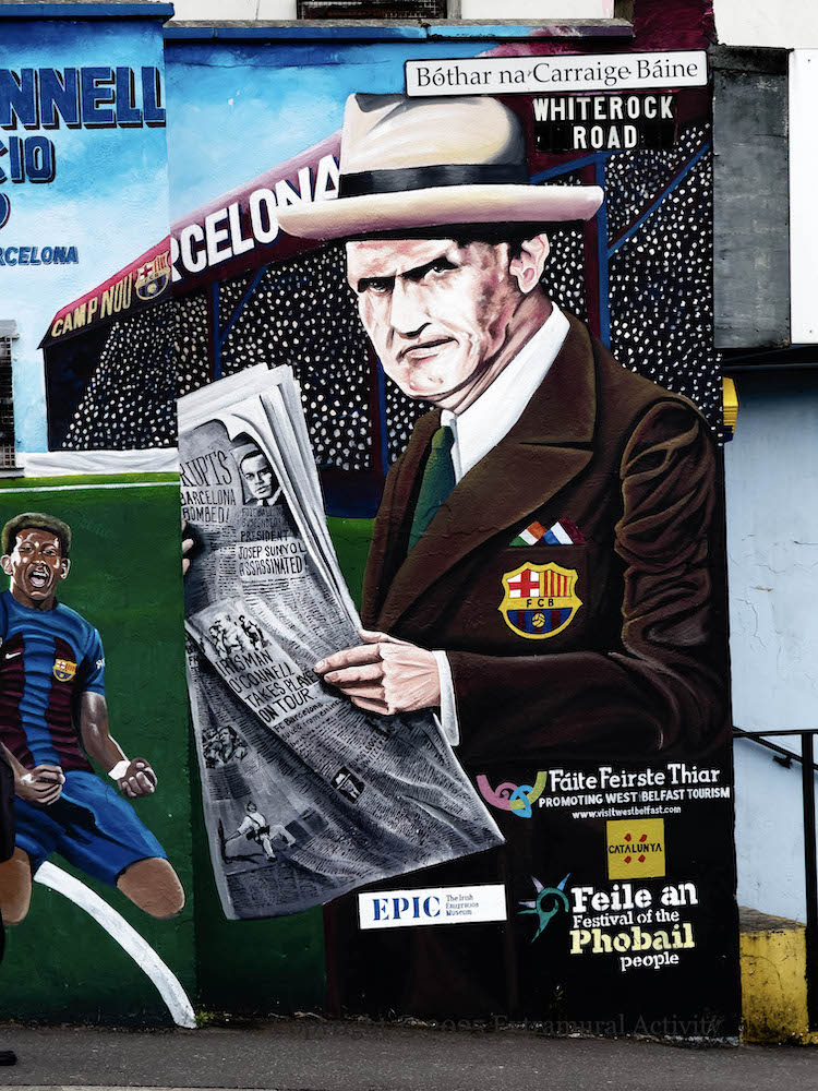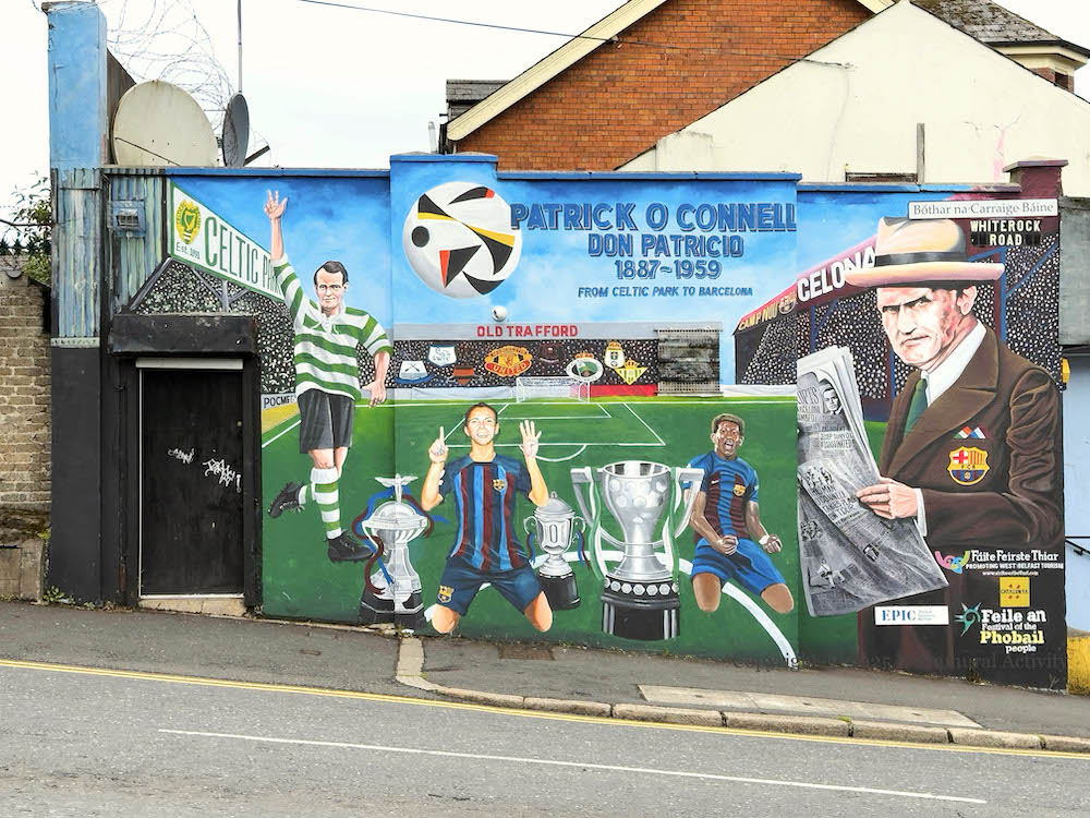 The Don Patricio/Patrick O’Connell mural at the bottom of the Whiterock Road was refreshed for Féıle 2024. The major change is in the middle of the mural, where Lionel Messi – who went to Paris Saint-Germain in 2021 and then to Inter Miami in 2023 – has been replaced by current stars Aitana Bonmatí and Lamine Yamal. (A modern soccer-ball replaces the leather ball of the original mural, patches have been added to O’Connell’s jacket, and the FAI trophy and the large Cup Winner’s medal has been removed to make room for Bonmatí.) The new mural was relaunched on August 2nd, 2024, with an address by the director of the FC Barcelona museum at Camp Nou (Belfast Media).