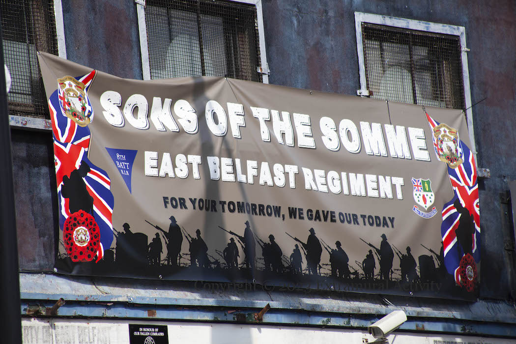 Also from the Club: a gallery of Rangers’ Managers in We Welcome The Chase | commemorative murals to the 36th Division in A Name That Equals Any In History, the three Scottish soldiers in Highland Fusiliers, and to the UDR in Some Gave All | various others from the laneway and courtyard in We Don’t Do Walking Away.