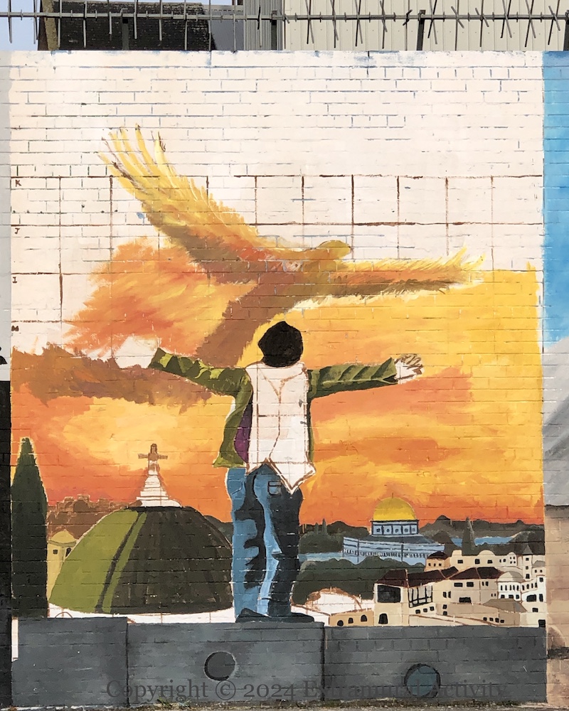 The launch event for the Painting For Palestine project (Fb) took place on March 3rd. A large paper Palestinian flag (with the cartoon character of resistance Handala (WP) on it) was used as a cover over the mural of three children – Irish, Palestinian, and South African – and unveiled by local children who had worked on the piece.