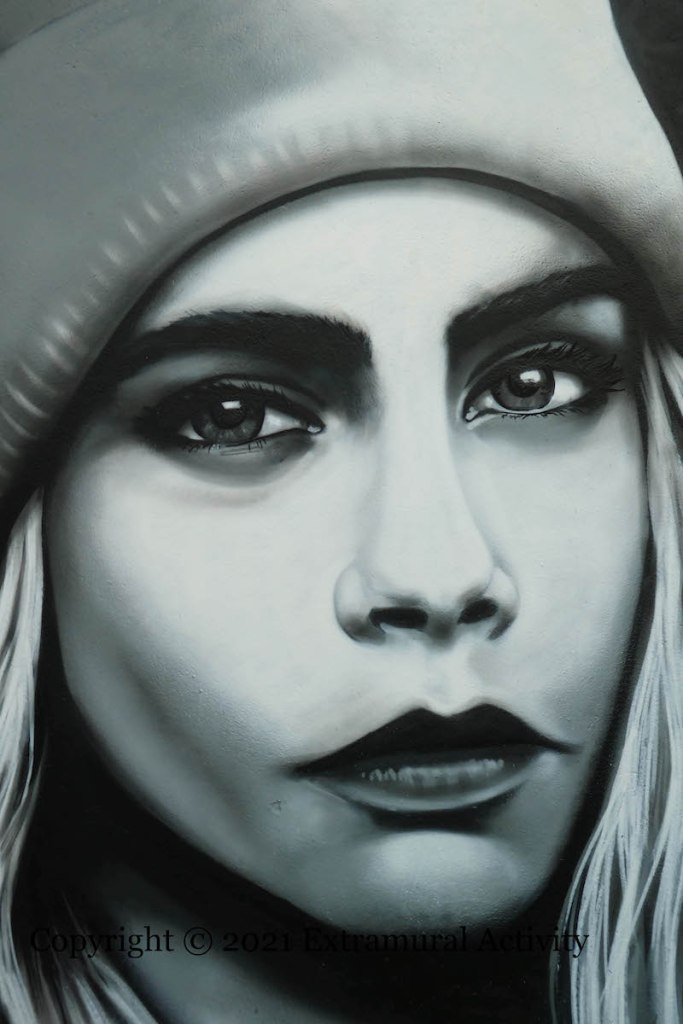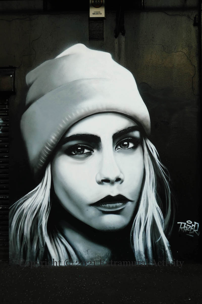 London street artist Irony (ig) drew on Edwin Landseer’s 1851 painting The Monarch Of The Glen (WP) for this piece of street art – fitting with its location as both near the Glen area of London-/Derry and formerly the old Scotch quarter (Derry Journal) – but updating it for contemporary audiences with an environmental message and the source of its less formal name: Stag With A Bag.