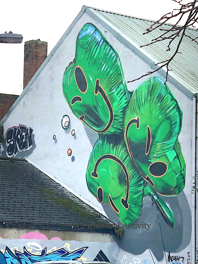 London-based artist Fanakapan (ig) specialises in what he calls “balloon graff”. For his trip to HTN2021 he painted shamrock smiley faces. Kent Street car park, Belfast.
