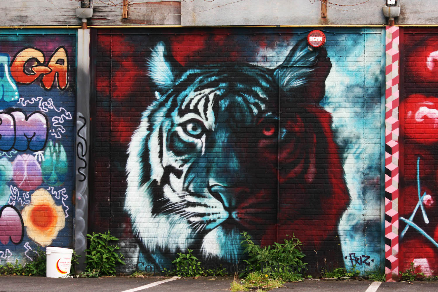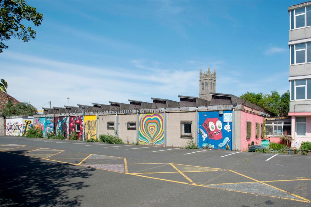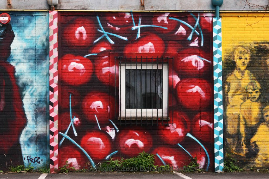 Keeping an eye on the courtyard of Vault HQ (web | tw | ig) in Tower Street, a majestic tiger by Friz (web | tw | ig). The tiger is in the third spot. FGB’s raspberry man is in the first spot. Cherries by unknown artist in the fourth; the fifth spot is “25 Tower Street” by Ed Reynolds. The wide shot shows the five panels plus Show Some Love and FGB’s Build Communities. “Yes Big Lad” and the flower tribute to Ash are on the other side of the carpark, near the road.