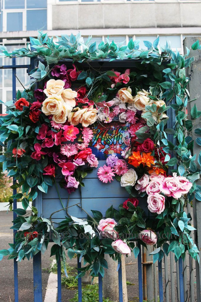 Another World Belfast (web | Fb) collects toiletries and underwear for distribution – via local charities and community groups – in “Love Packs”. This ‘heart of hearts’ mural in support of the project is in the grounds of the Vault Artists (Fb | tw) in East Belfast.