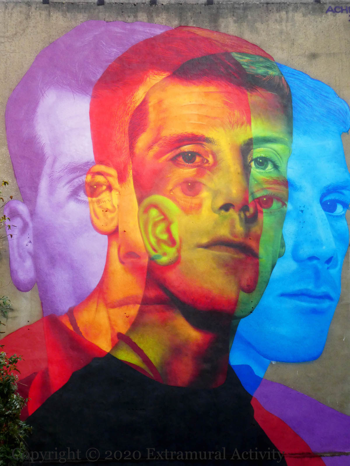 Dublin artist Aches (ig) was in town for HTN last week, working on a large wall in Kent Street car park, above the North Street bingo hall. The model is Stephen Considine from BipolarBear Wear (web | ig) which sells gear to raise money for mental health charities.