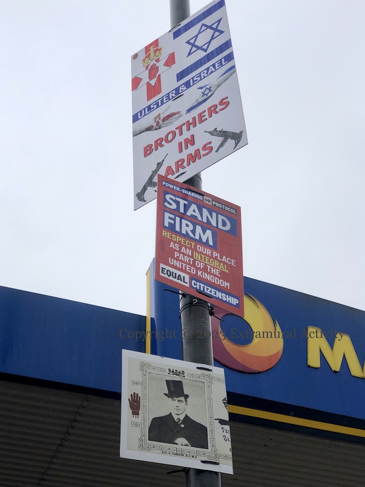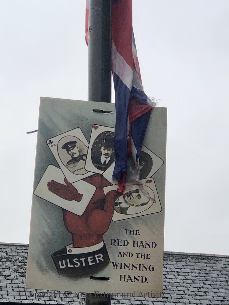 The placard in the middle, between Brothers In Arms and “Sir E. Carson K.C., M.P.” was discussed in Stand Firm. The Winning Hand was seen previously in The Red Hand And The Winning Hand.