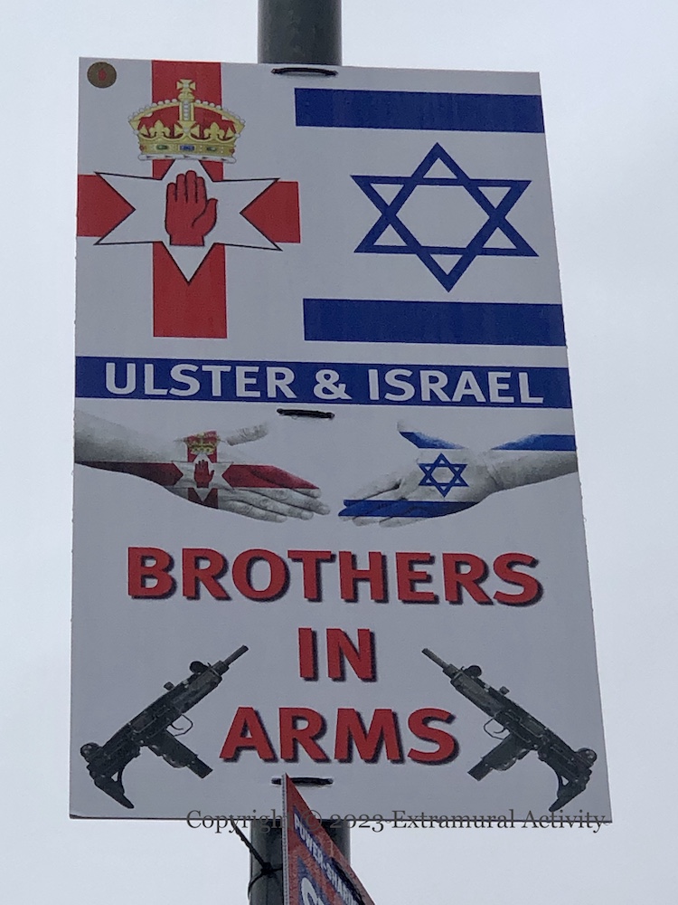 “Ulster & Israel – brothers in arms”. The Uzi was developed in Israel in the late 1940s and became a general-issue weapon in 1956 (WP). It was used (and copied) by loyalist paramilitaries in Northern Ireland (Balaclava Street has a comprehensive history of loyalist weaponry) and appeared in a both UDA and UVF murals and graffiti: The Elite | Ulster Says No! To The Politicians | Sandy Row 2nd Batt | UFF Uzi.