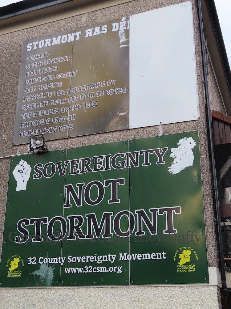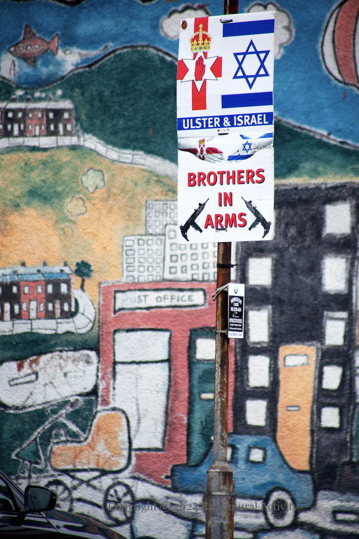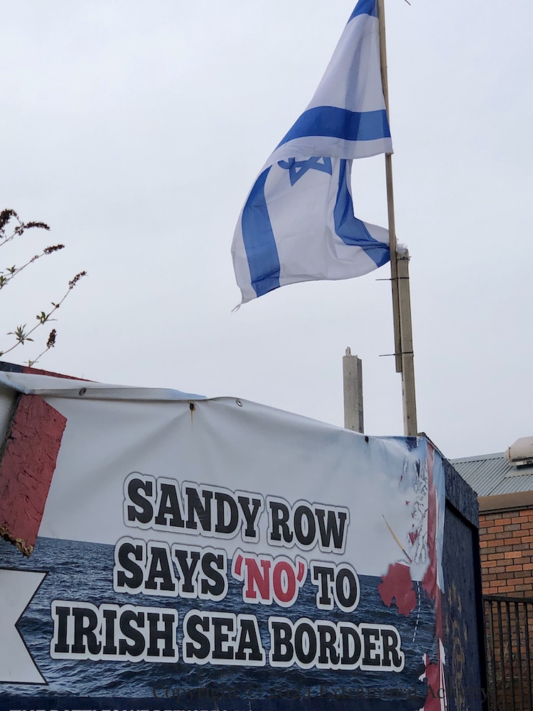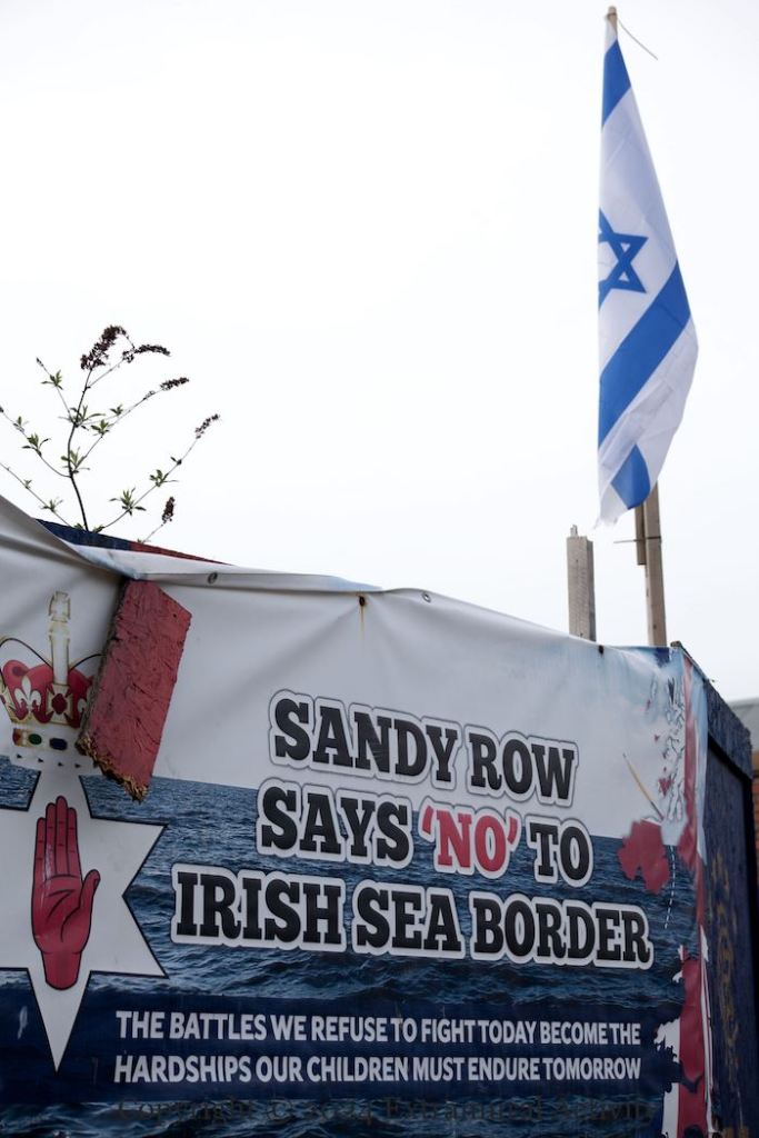 Sandy Row says “no” to an Irish Sea border, but “yes” to Israel’s invasion of Gaza. The verbiage along the bottom of the tarp reads, “The battles we refuse to fight today become the hardships our children must endure tomorrow.”
