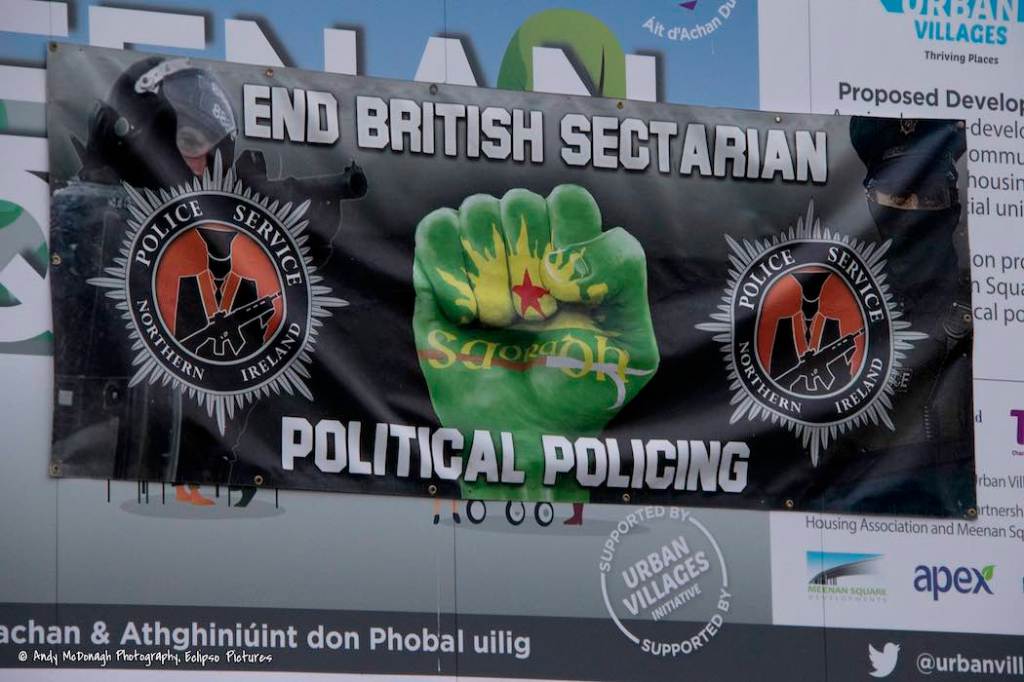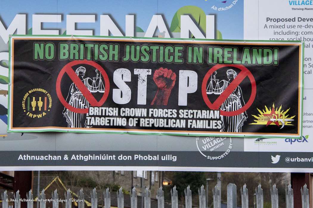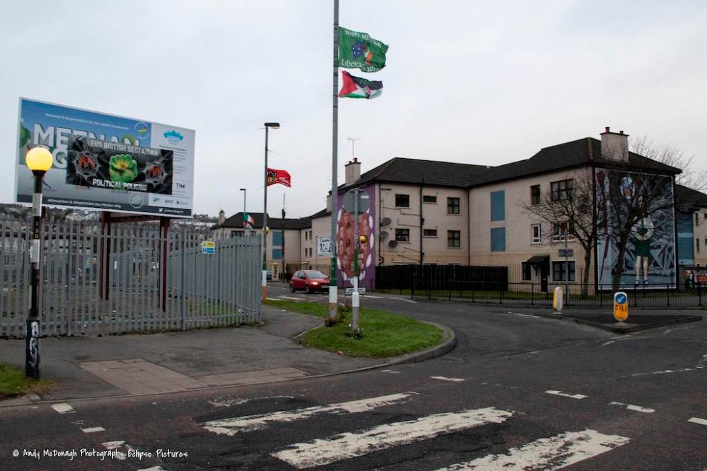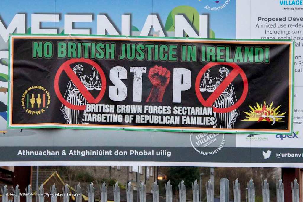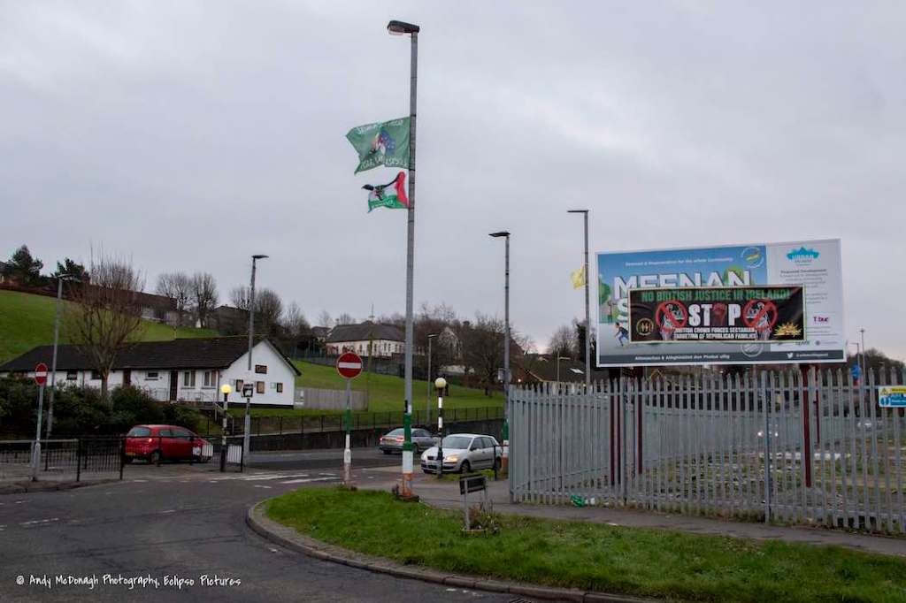 90% of Meenan Square was bought by Apex Housing for redevelopment with funds from the Executive Office (EO Press Release | Derry Now) in April 2023. 11 million pounds of T:BUC’s 45 million has been put towards the project (Derry Journal). Demolition took place in August, 2021, but it remains a waste-ground. In the meantime, Saoradh (web) and the IRPWA (web) have commandeered the hoarding for two tarps protesting “British Crown forces’ sectarian targeting of republican families” and “sectarian political policing”.