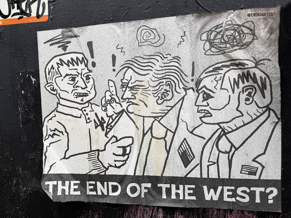 Third, below, “Do you know the traffic warden?” Last below, “The end of the West?” – Donald Trump and JD Vance berate Ukranian president Vlodomir Zelenskyy in the White House in February, 2025 (PBS).