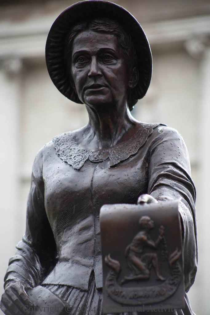 In this new statue in the grounds of Belfast city hall, Mary Ann McCracken is shown handing out abolitionist leaflets with a pleading enslaved woman above the words “Am I not a woman and a sister?” The same supplicant image is on the medallion (perhaps made by Wedgwood for the Society For The Abolition Of The Slave Trade – WP) worn at her throat. See also: The Blots On The Page Are So Black and The World Affords No Enjoyment Equal To That Of Promoting The Happiness Of Others.