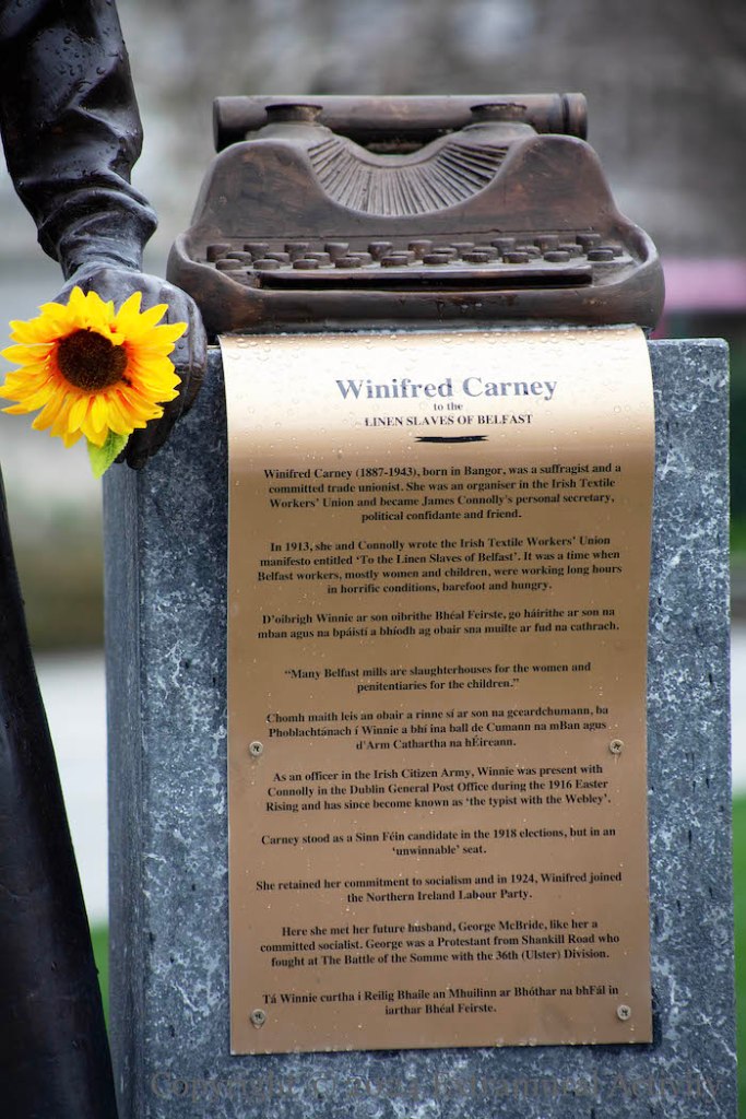 “Winifred Carney, born in Bangor, was a suffragist and a committed trade unionist. She was an organiser in the Irish Textile Workers’ Union and became James Connolly’s personal secretary, political confidante and friend. In 1913, She and Connolly wrote the Irish Textile Workers’ Union manifesto entitled ‘To the Linen Slaves of Belfast’. It was a time when Belfast workers, mostly women and children, were working long hours in horrific conditions, barefoot and hungry. “D’oıbrıgh Winnie ar son oıbrıthe Bhéal Feırste, go háırıthe ar son na mban agus na bpáıstí a bhíodh ag obaır sna muılte ar fud na cathrach. “Many Belfast mills are slaughterhouses for the women and penitentiaries for the children.” Chomh maıth leıs an obaır a rınne sí ar son na gceardchumann, ba Phoblachtánach í Winnie a bhí ına ball de Chumann na mBan agus d’Arm Cathartha na hÉıreann. As an officer in the Irish Citizen Army, Winnie was present with Connolly in the Dublin General Post Office during the 1916 Easter Rising and has since become known as ‘the typist with the Webley’. Carney stood as a Sınn Féın candidate in the 1918 elections, but in an ‘unwinnable’ seat. She retained her commitment to socialism and in 1924, Winifred joined the Northern Ireland Labour Party. Here she met her future husband, George McBride, like her a committed socialist. George was a Protestant from Shankill Road who fought at The Battle of the Somme with the 36th (Ulster) Division. Tá Winnie curtha ı Reılıg Bhaıle an Mhuılınn ar Bhóthar na bhFál ın ıarthar Bhéal Feırste.”