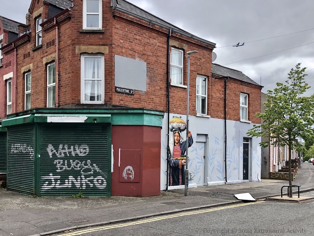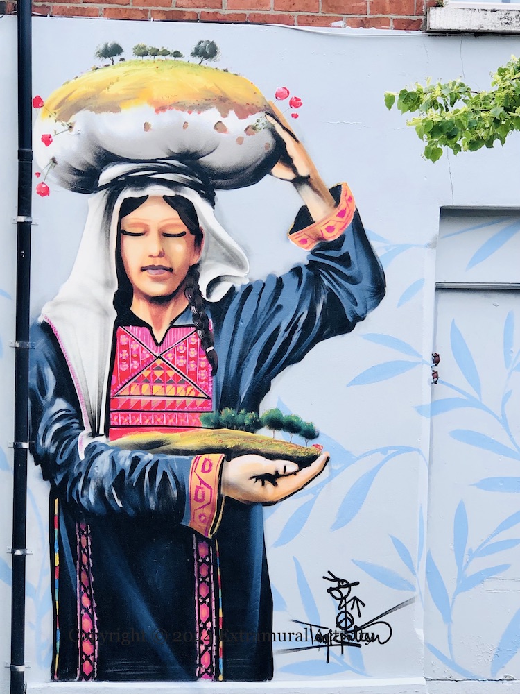 Palestinian artist Taqi Spateen’s (web | ig) second piece in Belfast is in Palestine Street in the Holylands of south Belfast, where he worked with Artists Against Genocide (ig) to produce a piece showing the strength of Palestinian women, carrying the land from which Palestinians have been evicted in the Nakba of 1948.