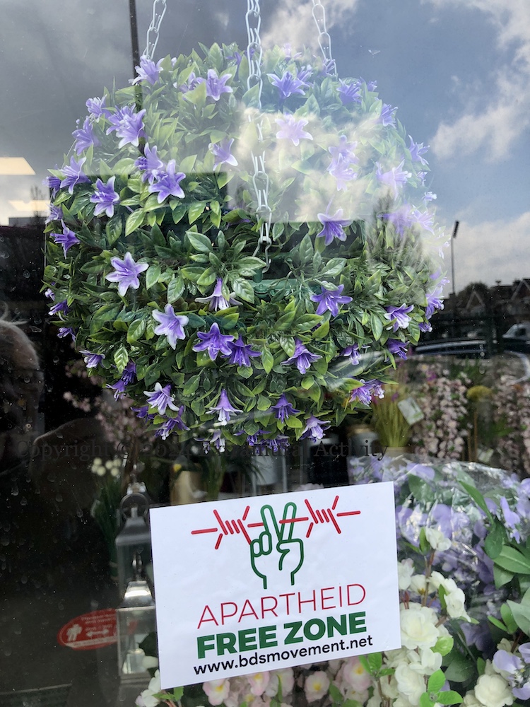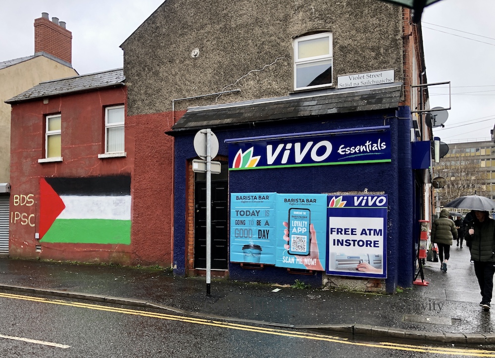 Here is an assortment of images concerning boycotts of Israeli goods in response to the invasion of Gaza. Above, “Ban Israeli goods” on the wall of the Alexandra Park Tesco, north Belfast; below, V-for-victory fingers as scissors snipping barbed wire (bdsmovement.net) in a shop window in Andersonstown, west Belfast; “BDS” [Boycott, divestment, sanctions] and “IPSC” [Ireland Palestine Solidarity Campaign, which maintains a list of Israeli goods] next to a painted Palestinian flag in the middle Falls, west Belfast; plus an Artists Against Genocide (ig) sticker.