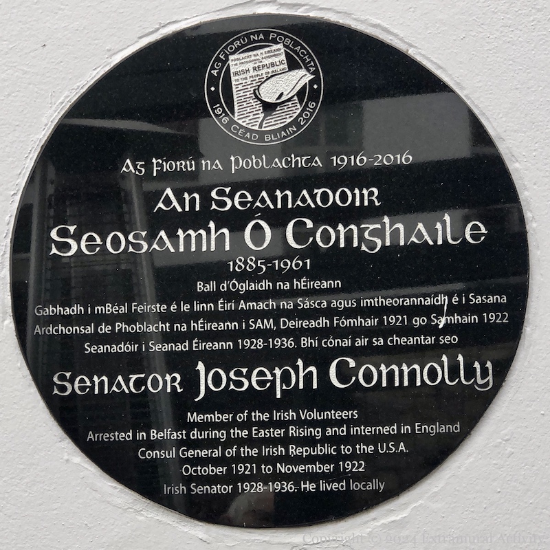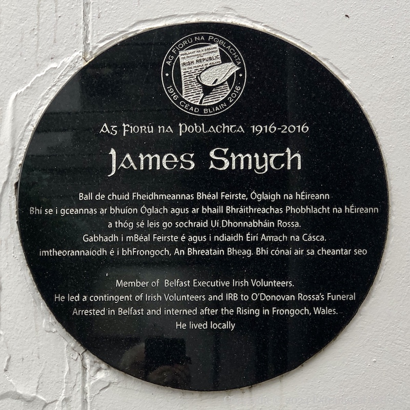 Also included are images of several memorial plaques from the courtyard, to James Smyth, Anraí (Harry) Osborne, and Seosamh Ó Conghaıle (Joseph Connolly); the Roger Casement plaque is on the Kieran Doherty mural in Slemish Way. “County Antrim Memorial: Tógaḋ an leaċt seo mar ċoṁarṫa urraıme, grá agus dílse do na saıġdıúırí uaısle as Contae Aontroma, a martraíoḋ ar son Ṗoblaċt Na hÉıreann. Ṡeas gaċ glúın díoḃ sa ḃearna ḃaoıl, ag troıd go cróga ċun aontaċt agus saoırse a ṫaḃaırt ar aıs do náısıún na nGael. Go spreaga an leaċt cuımhne seo na daoıne feasta ıonas go leana sıad lorg na laoċra dtí go mbéarfar bua uasal na saoırse ar ball. Erected by the Belfast Committee of the National Graves Association with generous co-operation from sub-committees in America and Dublin.”