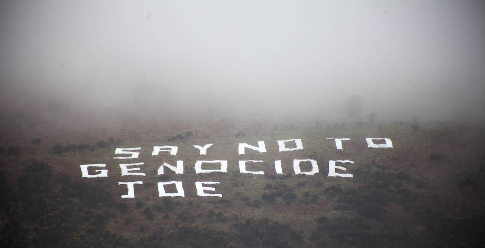 Sandy Row says “no” to an Irish Sea border, but “yes” to Israel’s invasion of Gaza. The verbiage along the bottom of the tarp reads, “The battles we refuse to fight today become the hardships our children must endure tomorrow.”