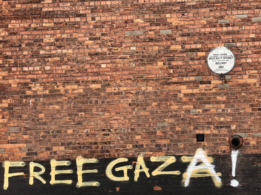 “Israeli Genocide” (Israel represented by the Star Of David) – This Antrim Road (north Belfast) graffiti protests the on-going Israeli attacks on cities in the Gaza Strip. The death toll of Palestinians now stands at more than 37,000 people, with 60% of residences destroyed (Al Jazeera).