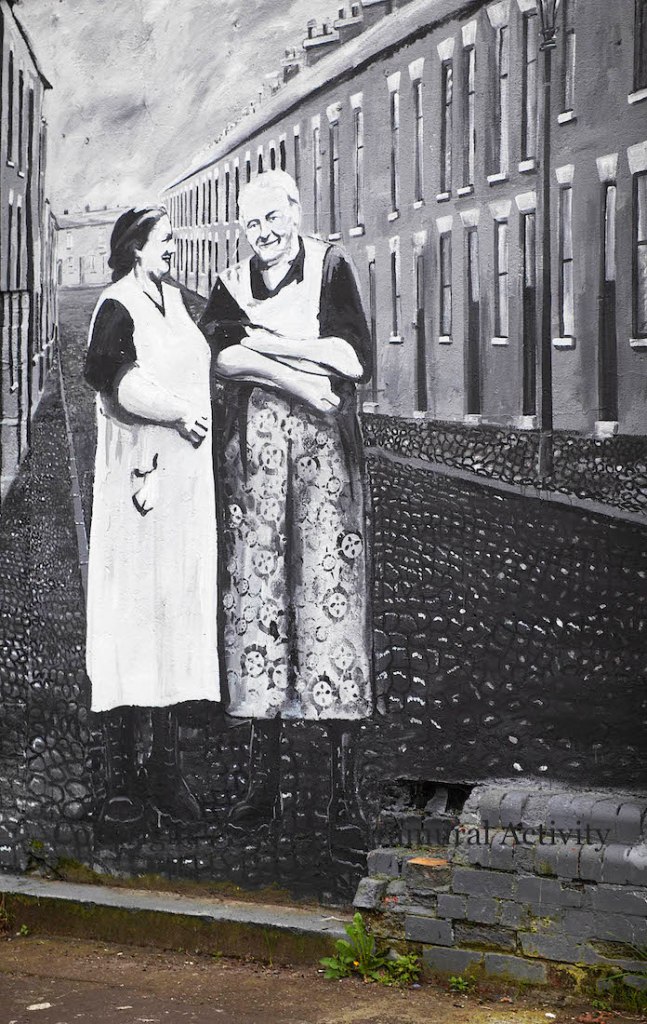 There is now a mural in Stanhope Street of “Carrick Hill in the old days”, of two women talking in the street, to complement the four printed boards.