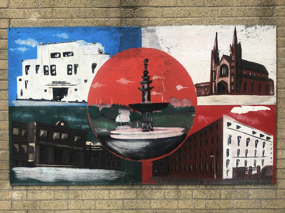 Below, a compilation of local landmarks: Broadway cinema (see At The Pictures), St Peter’s pro-cathedral (see Mysterious Ways), Conway mill (see The Mill), the Corporation Public Baths (and swimming pool), later the Falls Road Public Baths, and here called “The Falls Swimming Baths” (for a reminiscence of the baths, see Belfast History), and the fountain in Dunville Park. The cinema is no more; the baths have been replaced by a leisure centre; the mill stands but functions as a cultural centre.