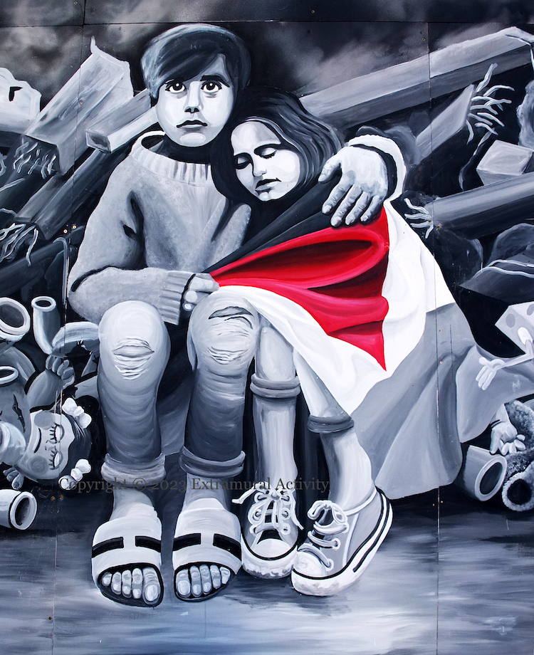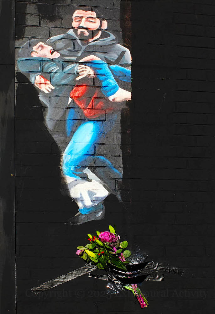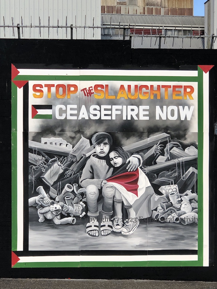 “Stop the slaughter – ceasefire now”. A pro-Palestinian board was added to the “International Wall”, Divis Street, and launched on November 4th. The previous Saber Al-Ashkar mural — His Land, His Legs, His Life — has been mostly painted over, with part of the mural remaining at the top and the image of a man carrying a wounded child perhaps deliberately left to the right of the board.