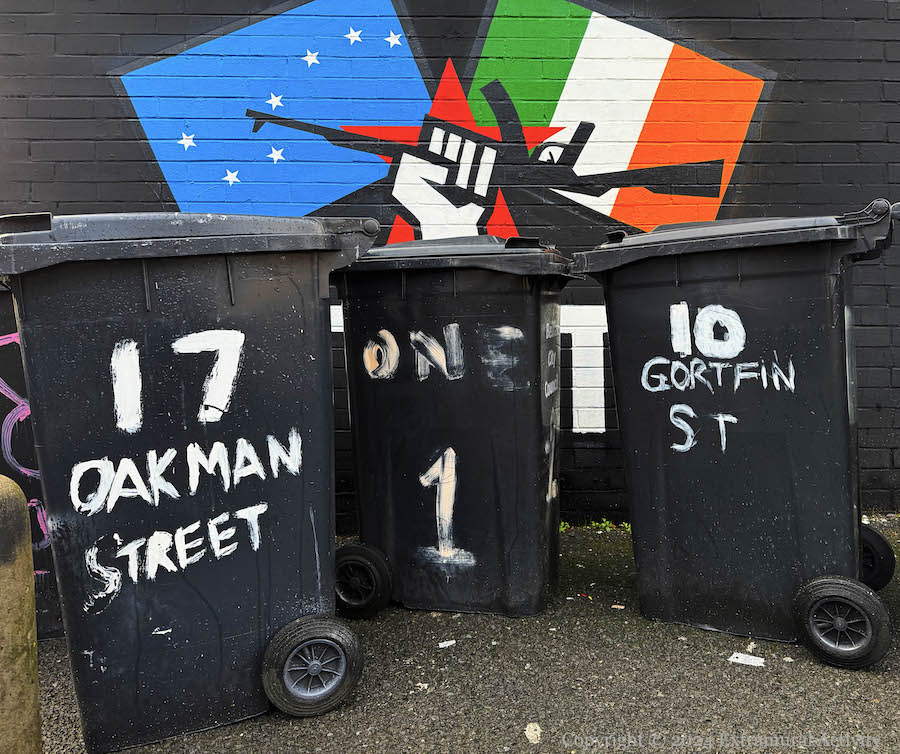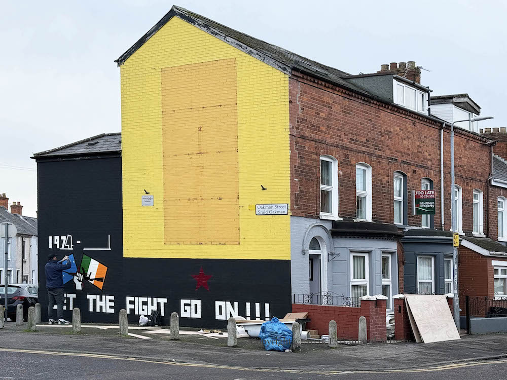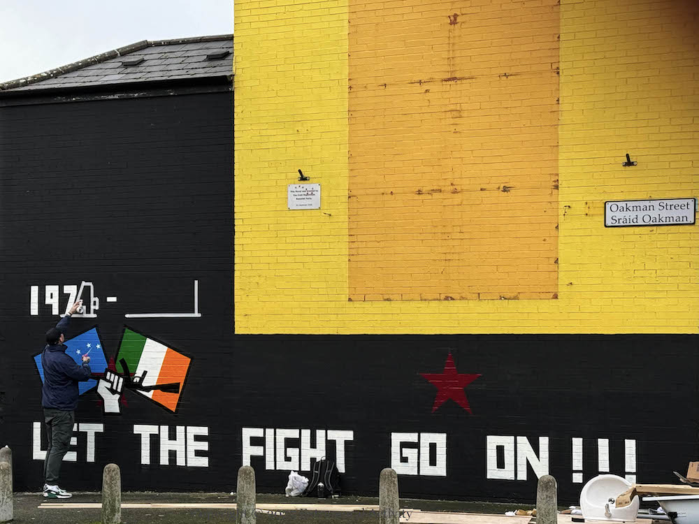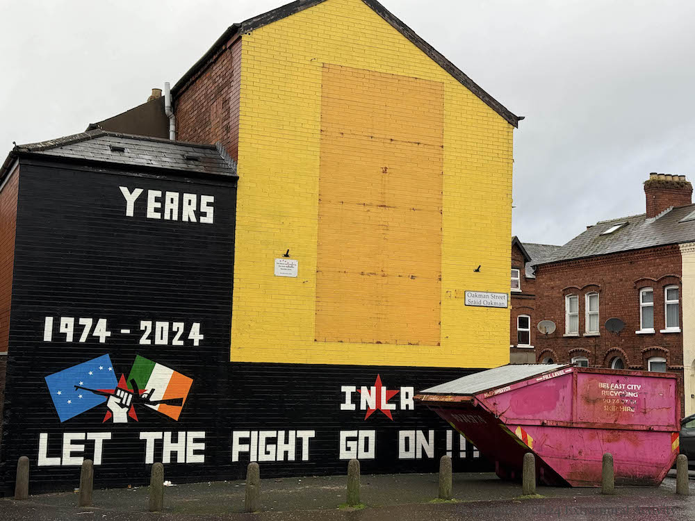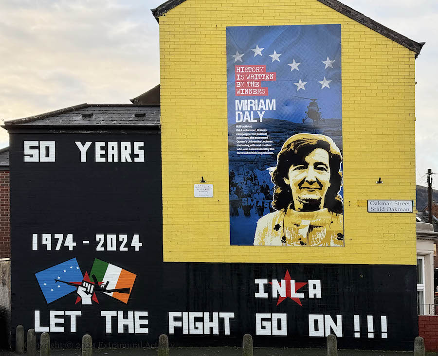 The large Miriam Daly board in Oakman Street was temporarily taken down while symbols and slogans to mark the fiftieth anniversary (“1974-2024”) of the creation of the INLA on December 8th, 1974 (WP) were mounted.
