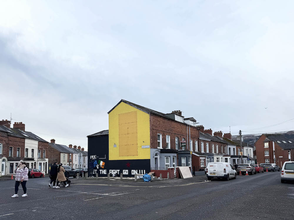The wall was completed by early December, 2024, and the roll of honour added in the top-left corner by the end of the month. Those listed are: Hugh Ferguson, Danny Loughran, Brendan McNamee, Miriam Daly, Ronnie Bunting, Noel Little, Jim Power, Matt McLarnon, Joe Craven, Paul “Bonanza” McCann, Thomas “Ta” Power, John O’Reilly, Mickey Kearney, Emmanual Gargan, Gino Gallagher, John McColgan, Patrick Campbell, Christopher “Crip” McWilliams, Harry O’Hara, Barry “Bar” McMullan, Martin McElkerney, James McWilliams. The last five post-date the Agreement, starting with Patrick Campbell, who died in 1999 at the hands of drug-dealers in Dublin (Irish Times | Bel Tel).