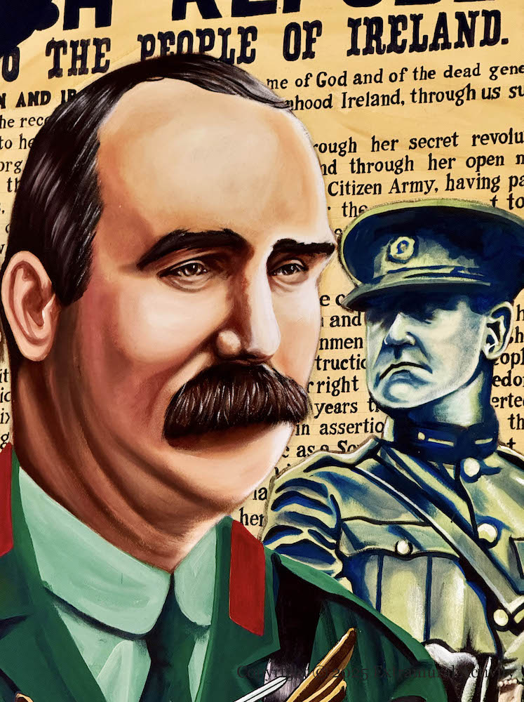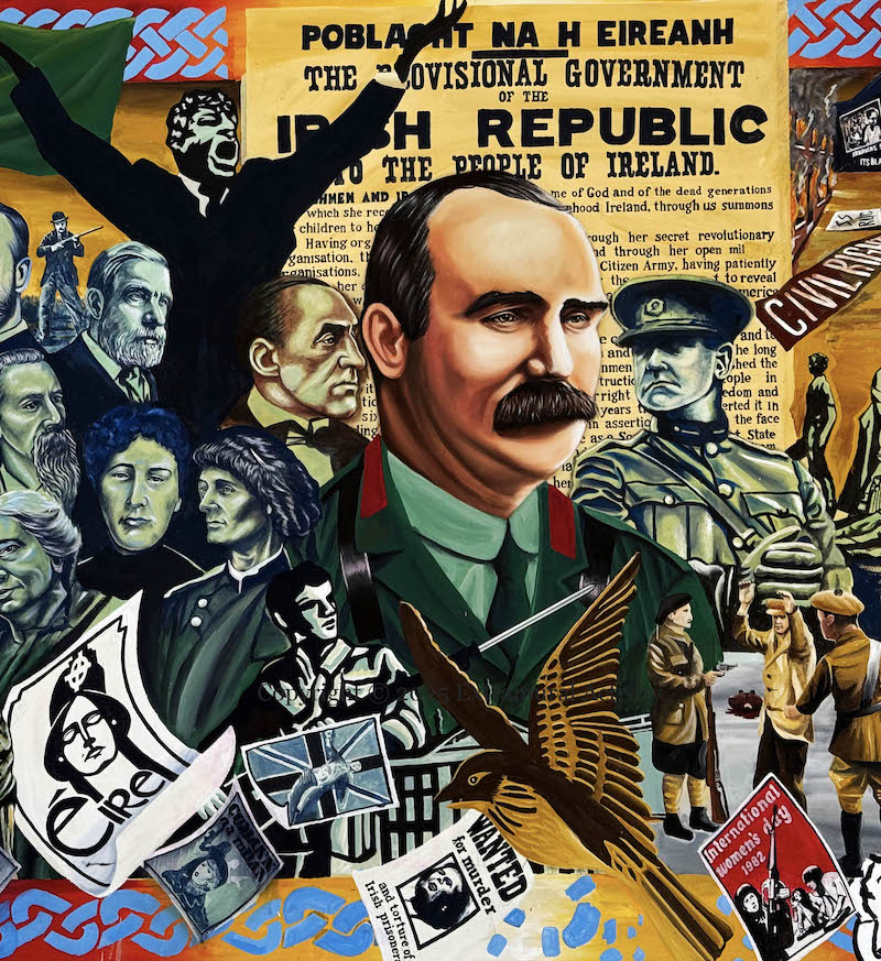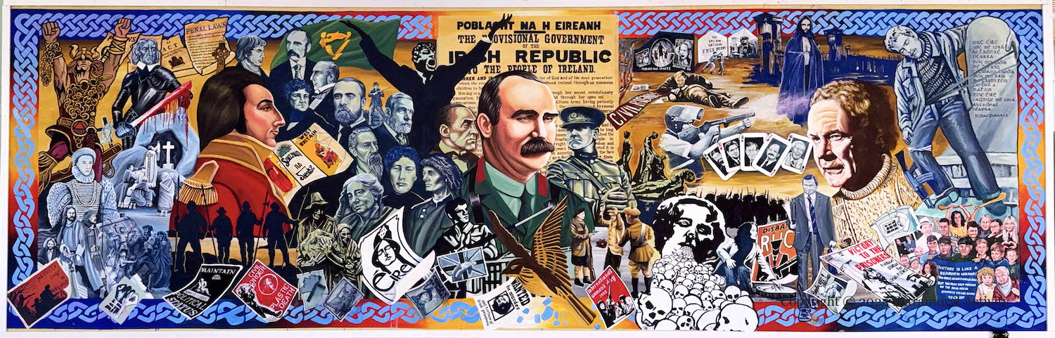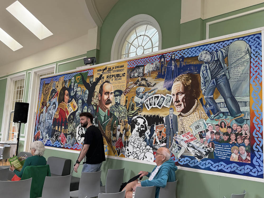 Féıle An Phobaıl (web) is now headquartered in the renovated (BCC) St Comgall’s on Divis Street in Ionad Eileen Howell, and during this year’s (2025) festival is home to an exhibition called “Vibrant Colours, Violent Past”, the centrepiece of which is a 20-foot-long panoramic history of republicanism, with Wolfe Tone, James Connolly, and Martin McGuinness as pivotal figures.