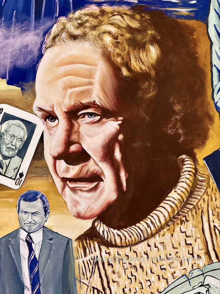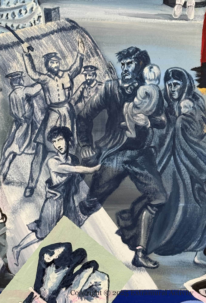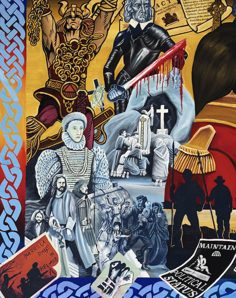 “From a casual meeting alongside Marty and Micky at work repainting the Vol. Kieran Doherty mural in Andersonstown came an inspired suggestion that we accept a challenge from him to tell our story graphically on a canvas rather than the usual brick wall, not just on canvas to hang on a wall in his gallery in L.A. but a canvas to cover the entire wall 20ft x 7ft!