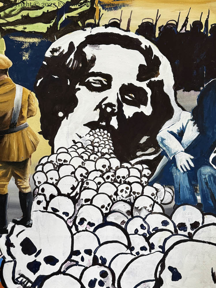 On the Republic side of the border, two boards are propped up on small trailers. The first reads “Israel/USA kill a classroom of kids every day” with a small drawing of a dove. Prior to the current (nominal) ceasefire, Palestinian children were killed at a rate of one every hour (Save The Children).
