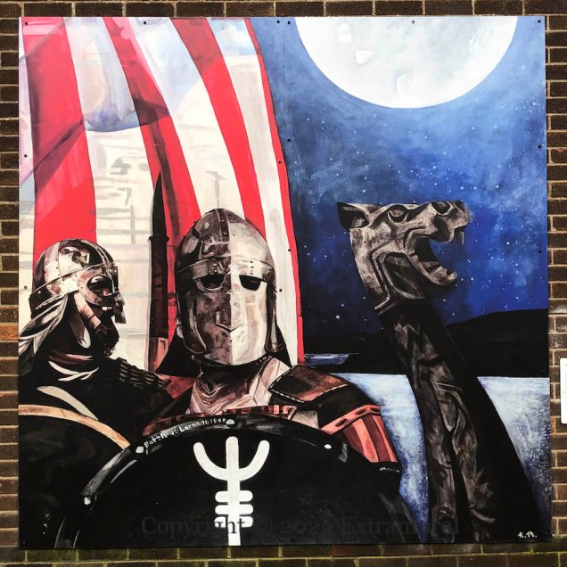 The official name of the outfit is “Valentine”. This is another of the Game Of Thrones-inspired pieces in Larne town centre – Lower Quay St in this case – sponsored by the Mid & East Antrim Council, with Larne Renovation Generation (Fb) and the Traders Forum (BelTel | News Desk | Fb video). See previously: Larne – The Original Tourist Resort | The Battle Of Ulfreksfjord | Dire Wolf.