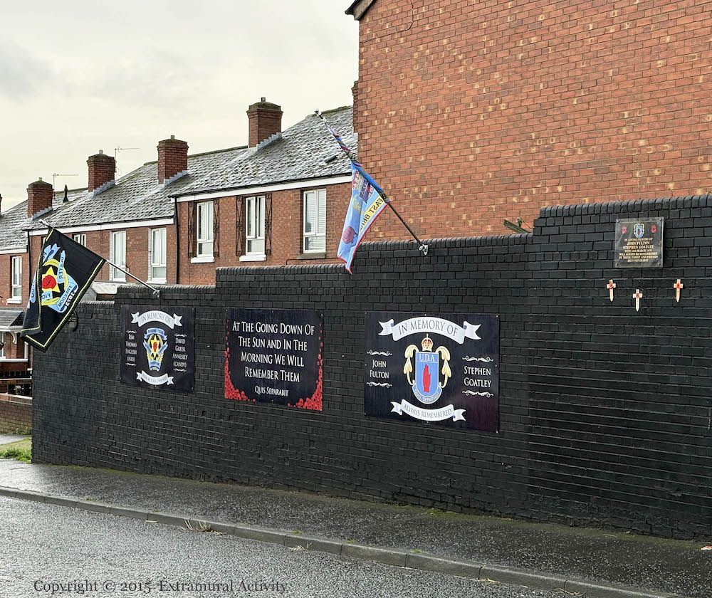 The two men named on the other board were also killed in a feud between the UDA and UVF, in 2000 – see Inky & Candy. “In loving memory Thomas (Inky) English & David (Candy) Greer Annesley. Together in the same old way/would be our dearest wish today./Silent memories true and tender/just to show we still remember.”